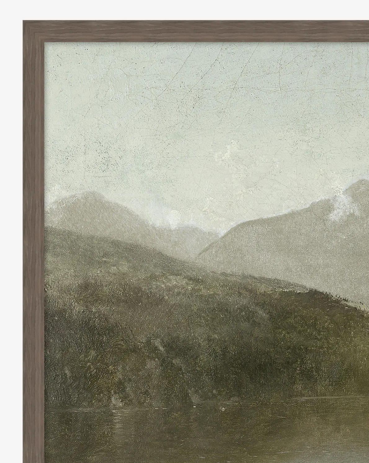 A powerful scene of rich forest green and misty gray comes to life with fine detail in Darsey Lake Peaks. With museum-quality techniques, this landscape painting is a giclee print on paper within a dark walnut wood frame. Its moody palette brings the peace and beauty of nature to your space.
