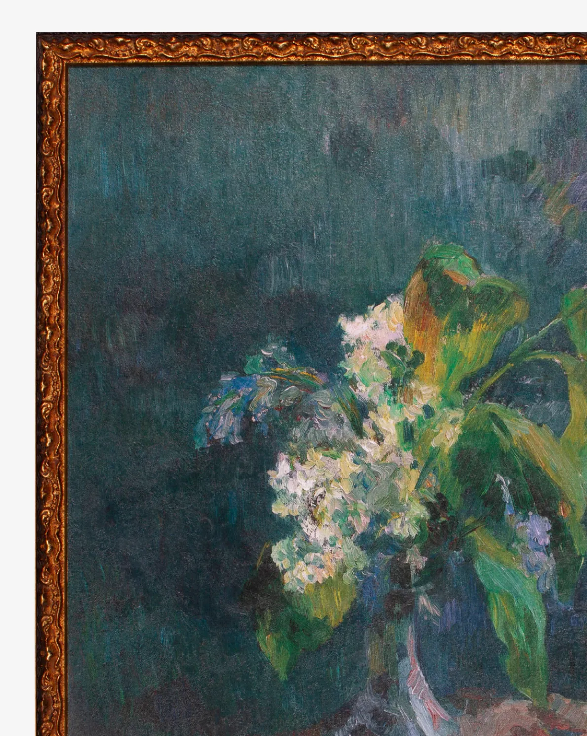 Elegant and moody, Lilac in a Vase brings beauty to your space with a colorful display of flowers in a vase against a dark background. Presented within a wood frame, this piece brings gallery-quality materials to your decor.