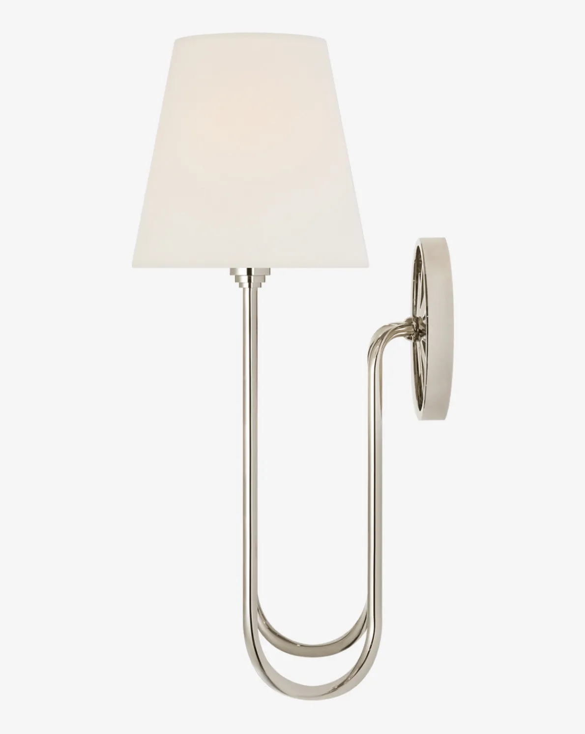 In your choice of finish, the Polaris Double Sconce is simple yet elevated. Its swooped arms bring an inviting feel to your space and complement the tapered white linen shades.