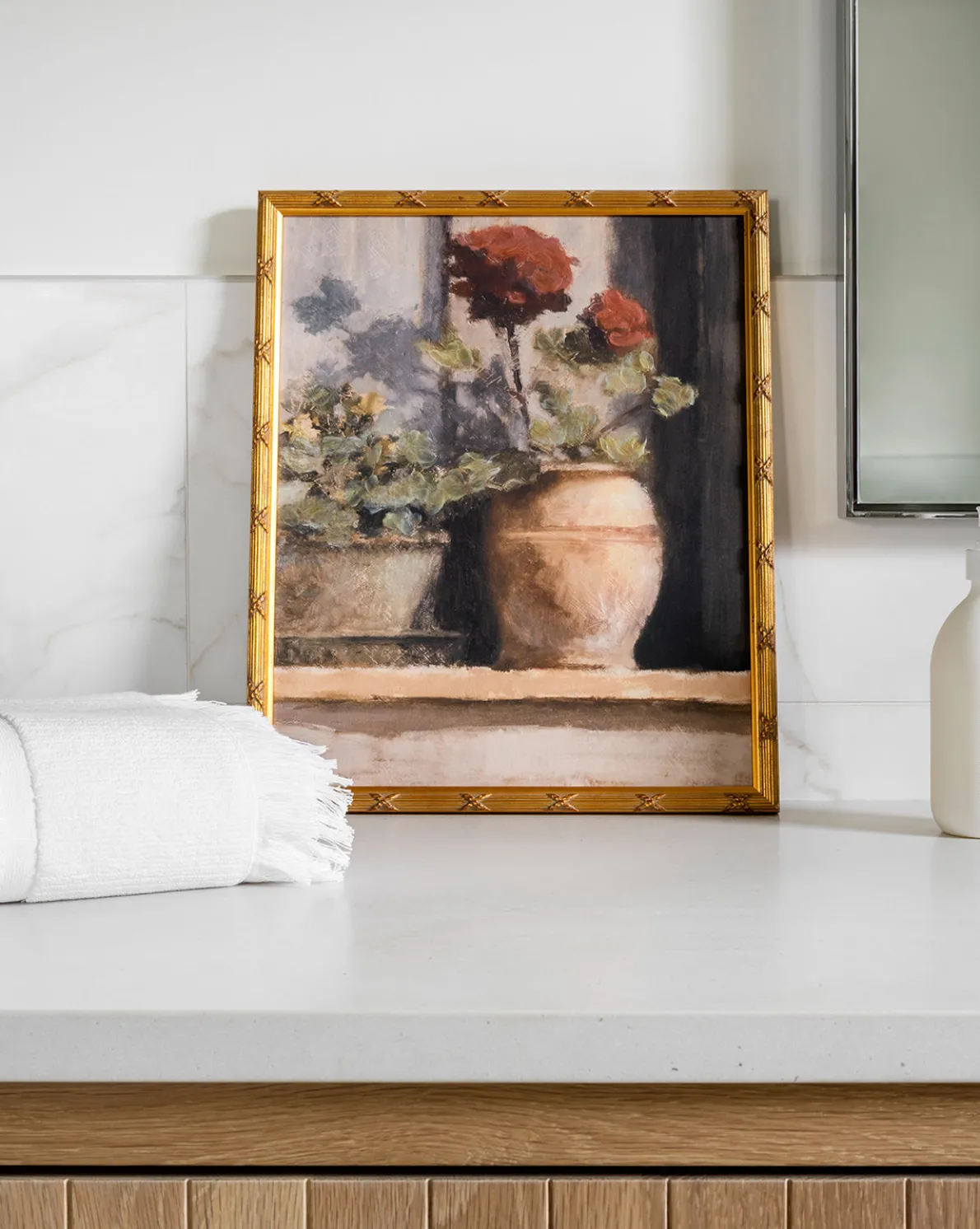 In a golden glow, Stoop Geraniums depicts flowers blooming tall in a romantic planter. Bringing a warm palette to your walls, this piece romantically captures what it truly means to bask in summer light.