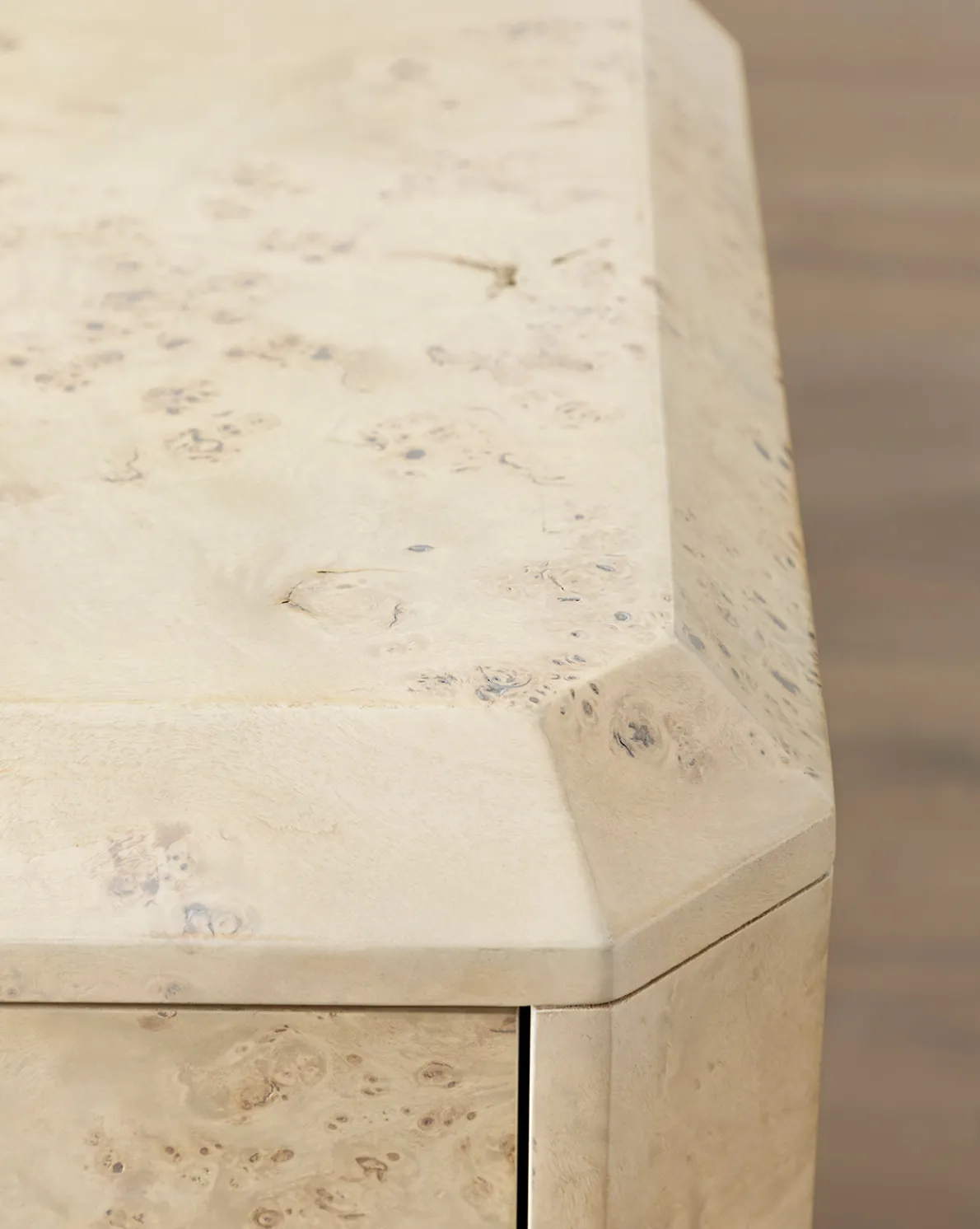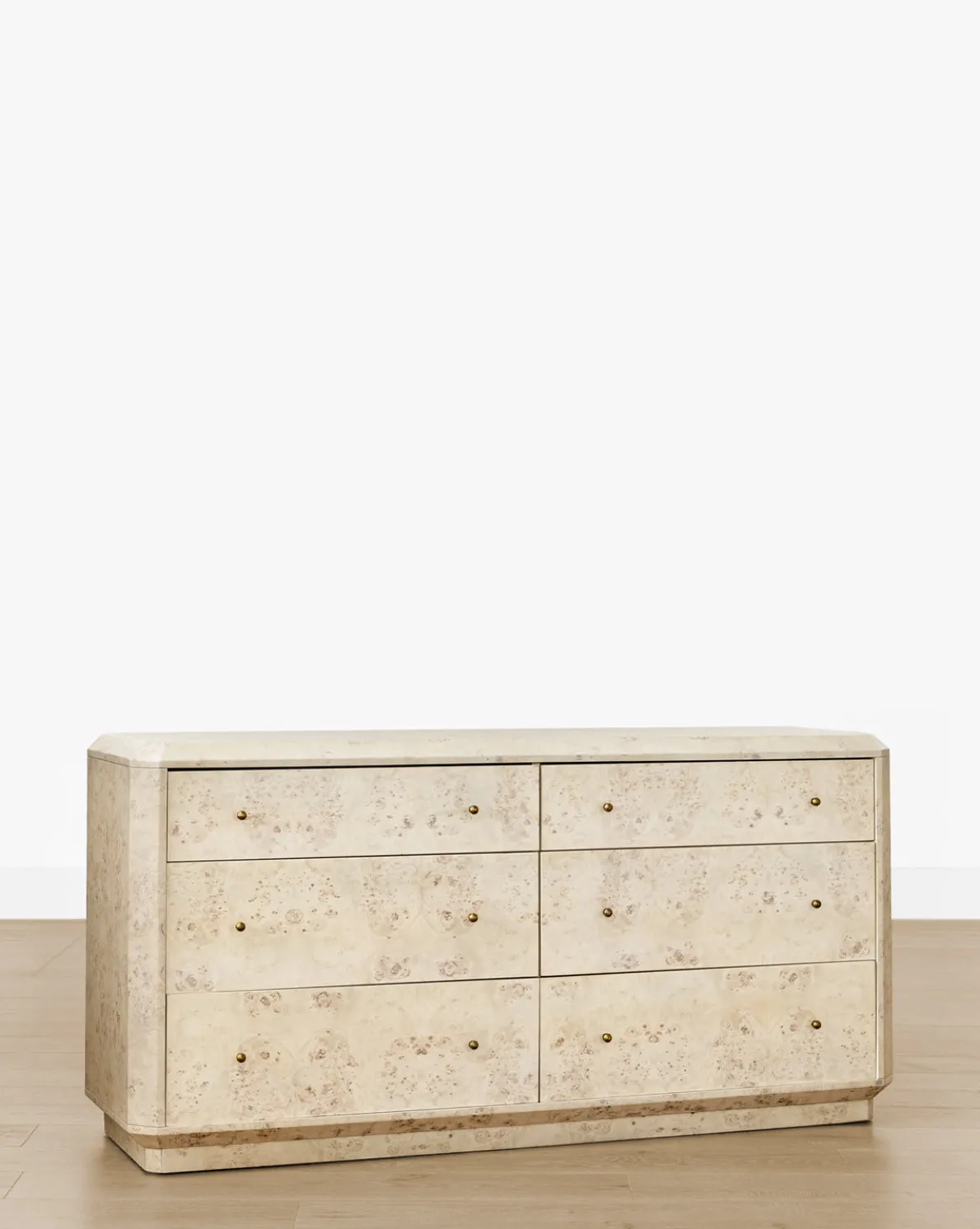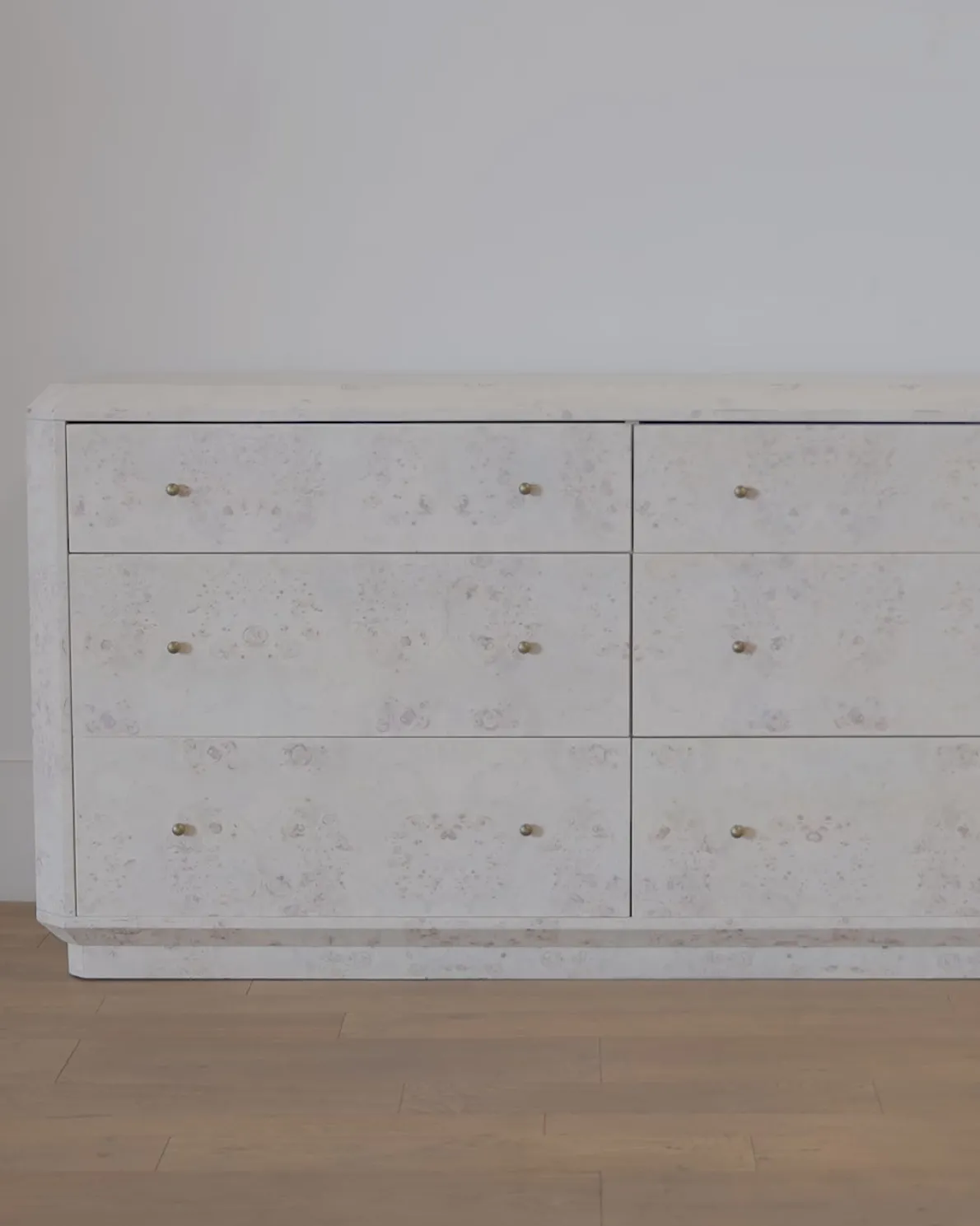 With the organic detail of solid burl wood and a whitewash finish, our Tali Light Burl Wood Dresser brings a light and airy feel to bedroom styling. Its modern construction has geometric elements, complemented by the refined antique brass pulls, filling your space with both function and beauty.