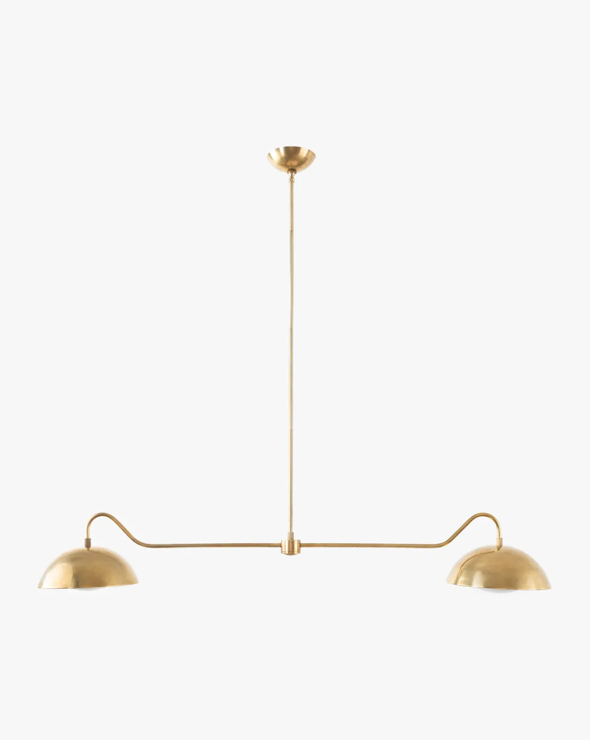 The Aldorno Linear Chandelier strikes a balance between pronounced lines and elegant curvature. Crafted from brass, the chandelier makes a soft statement in lighting designs from the dining room to the living room. Round shallow shades bring a nuanced shapeliness and classic feel to its simple form.