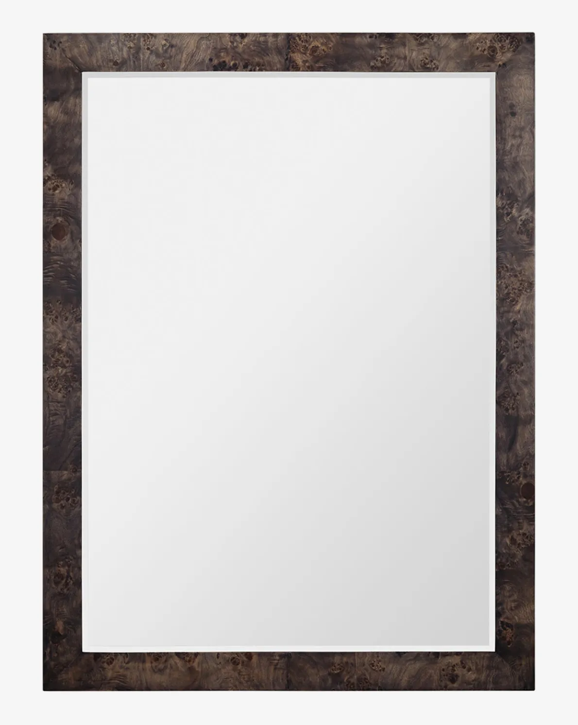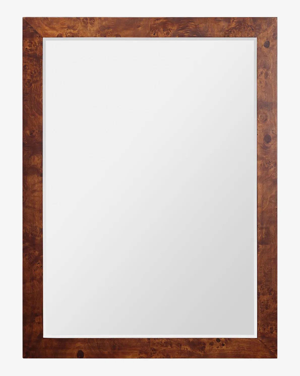 In a rich color, the Alexia Rectangular Mirror is a statement piece. Its frame that shows off the unique pattern of burl wood elevates your decor in any room, reflecting nature and amplifying light throughout the space.