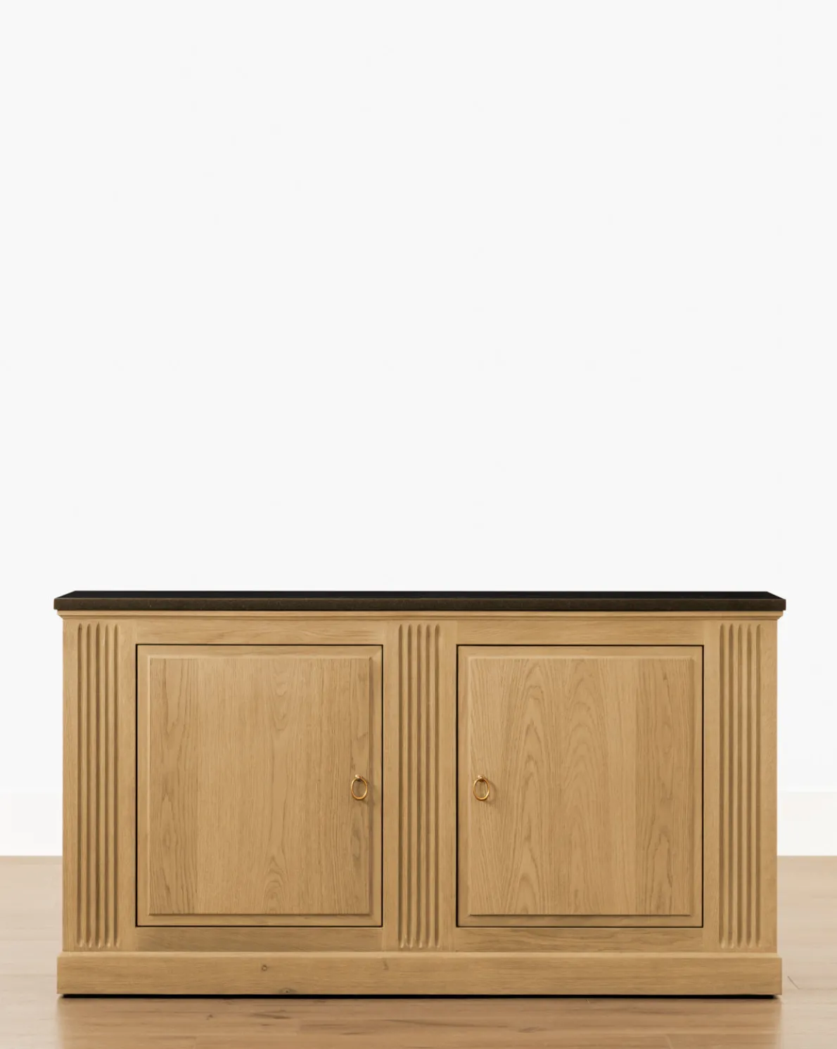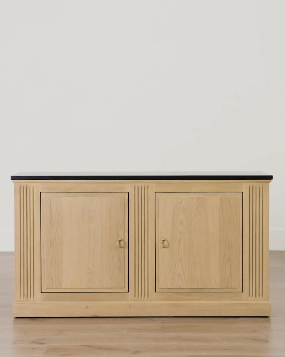 Featuring our exclusive Drift Oak finish and honed granite top, we designed the Ambrose Sideboard to bring a vintage yet organic feel to your space. The sideboard is adorned with solid brass drop pulls, vertical fluting, and wire brushed for a textural look and hand feel. With two soft close drawers and two adjustable interior shelves, the oak sideboard is a functional addition to your entryway or living room styling.