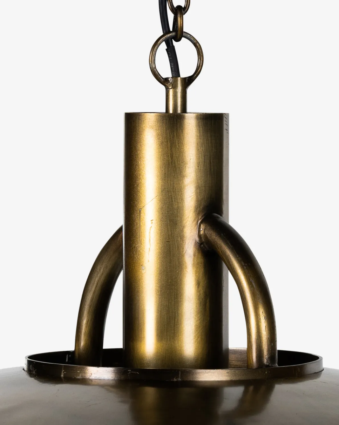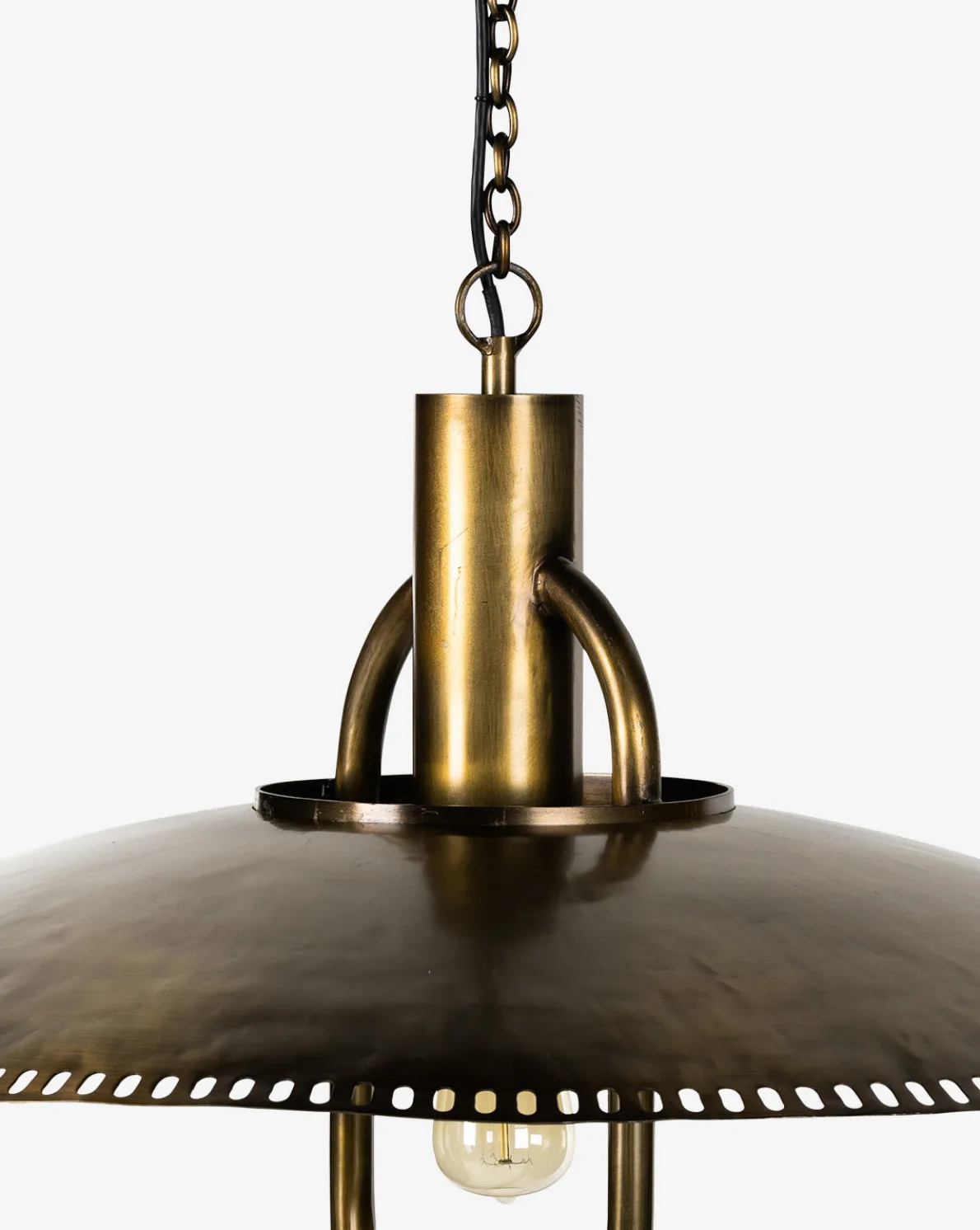 With a contemporary yet industrial feel, the thoughtful design of the Arely Pendant gives it a unique beauty. The large brass-finished shade features a subtly perforated edge, lending delicate detail to the boldly exposed bulb.