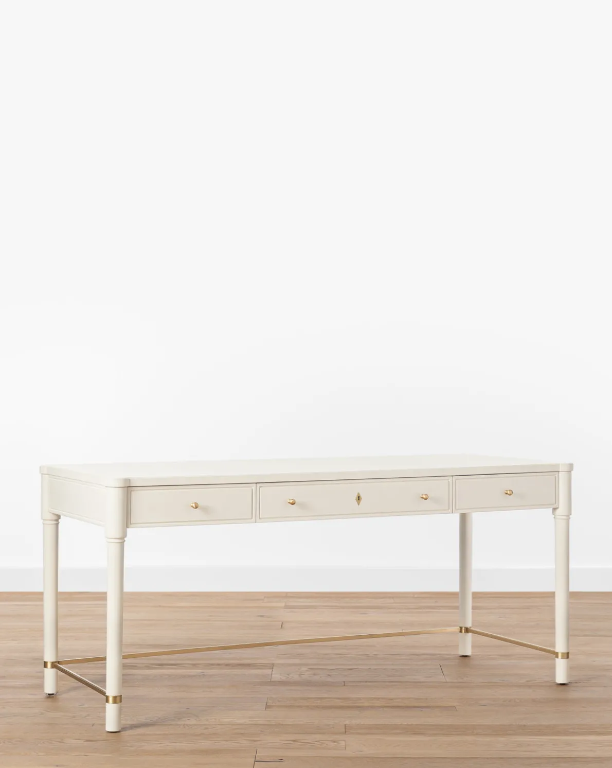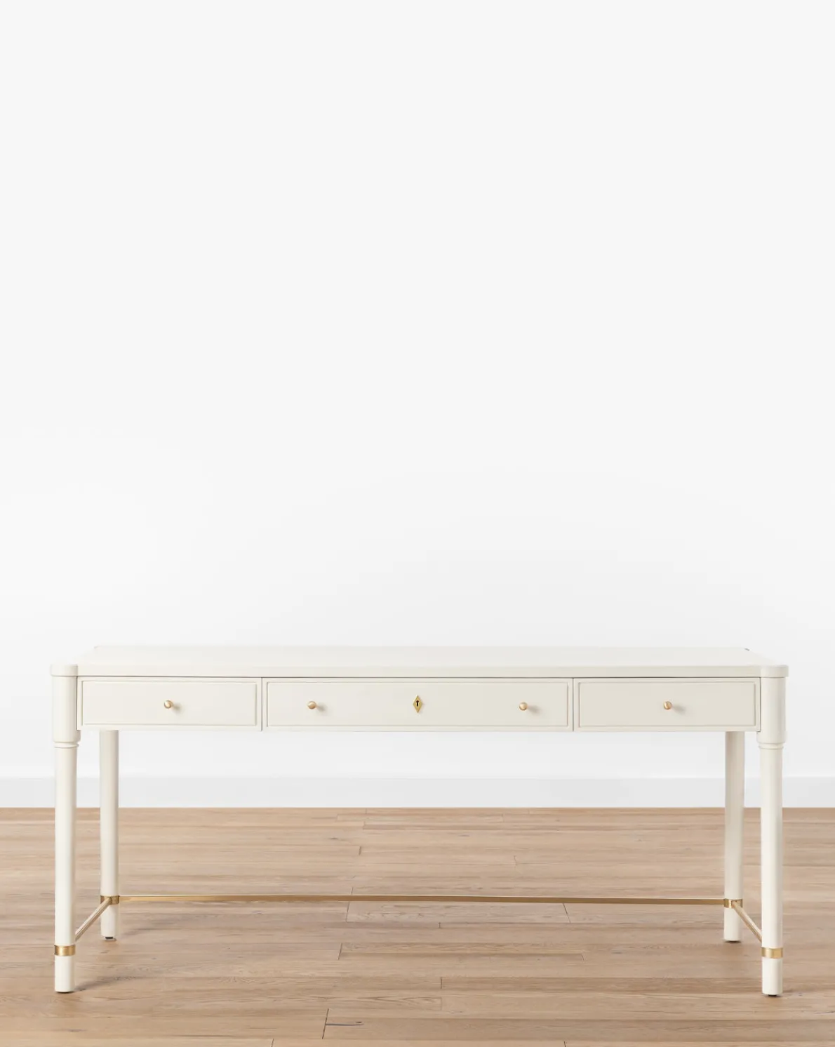 Featuring traditional details, our Arthur Wood Desk brings a classic feel to your home office. The oak desk’s sleek neutral tone and sleek brass hardware give interest without overwhelming your style, and its three drawers and wide surface provide practicality.