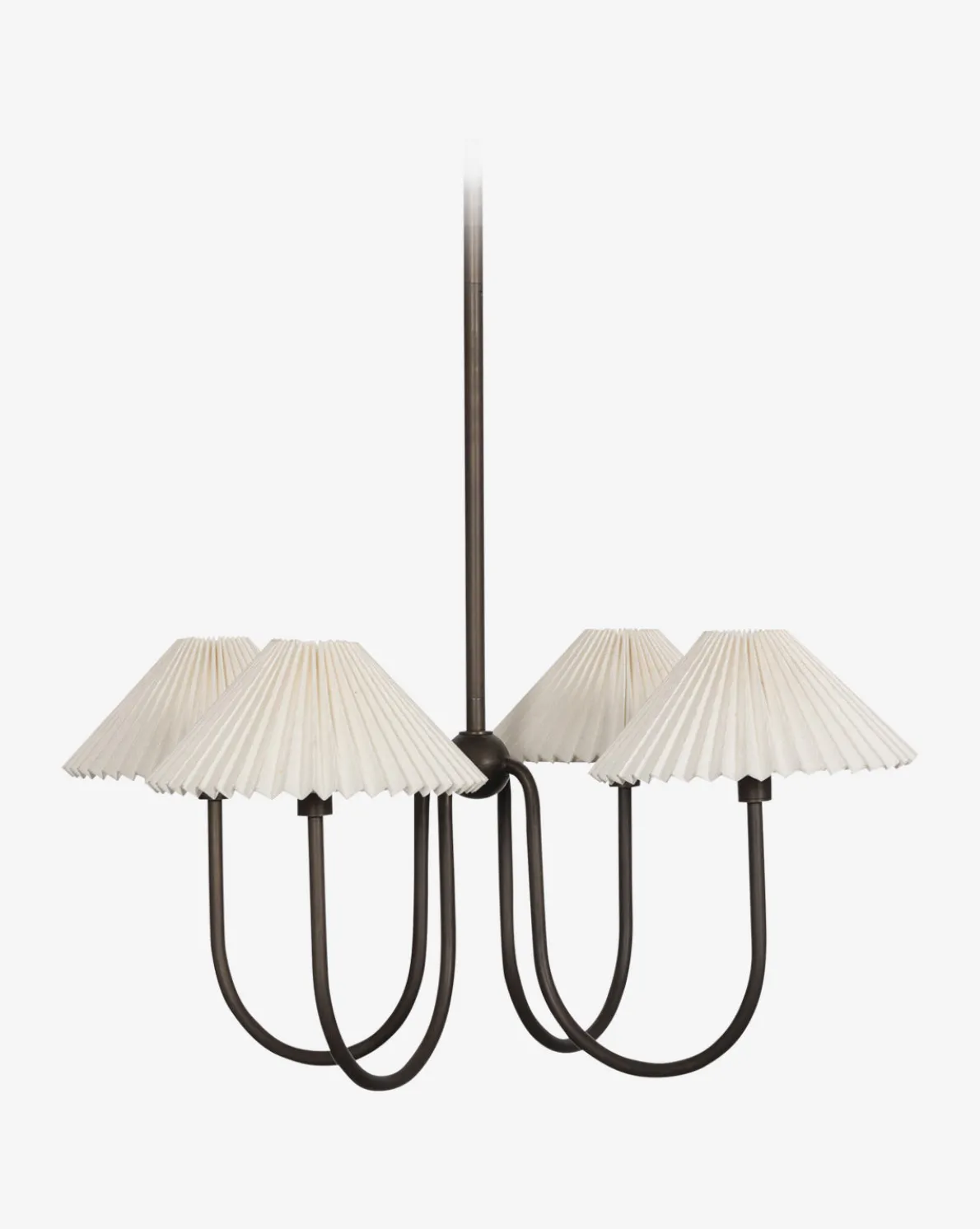 French-inspired, the Ashby Chandelier brings a classic warmth and traditional charm to your home lighting. Four curved light oil-rubbed bronze arms connect at a central ball detail, creating an elegant silhouette that pairs beautifully with the cream-toned pleated linen shades. It brings a refined sense of coziness wherever it is styled.