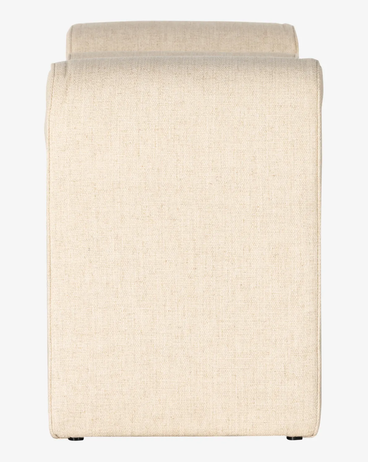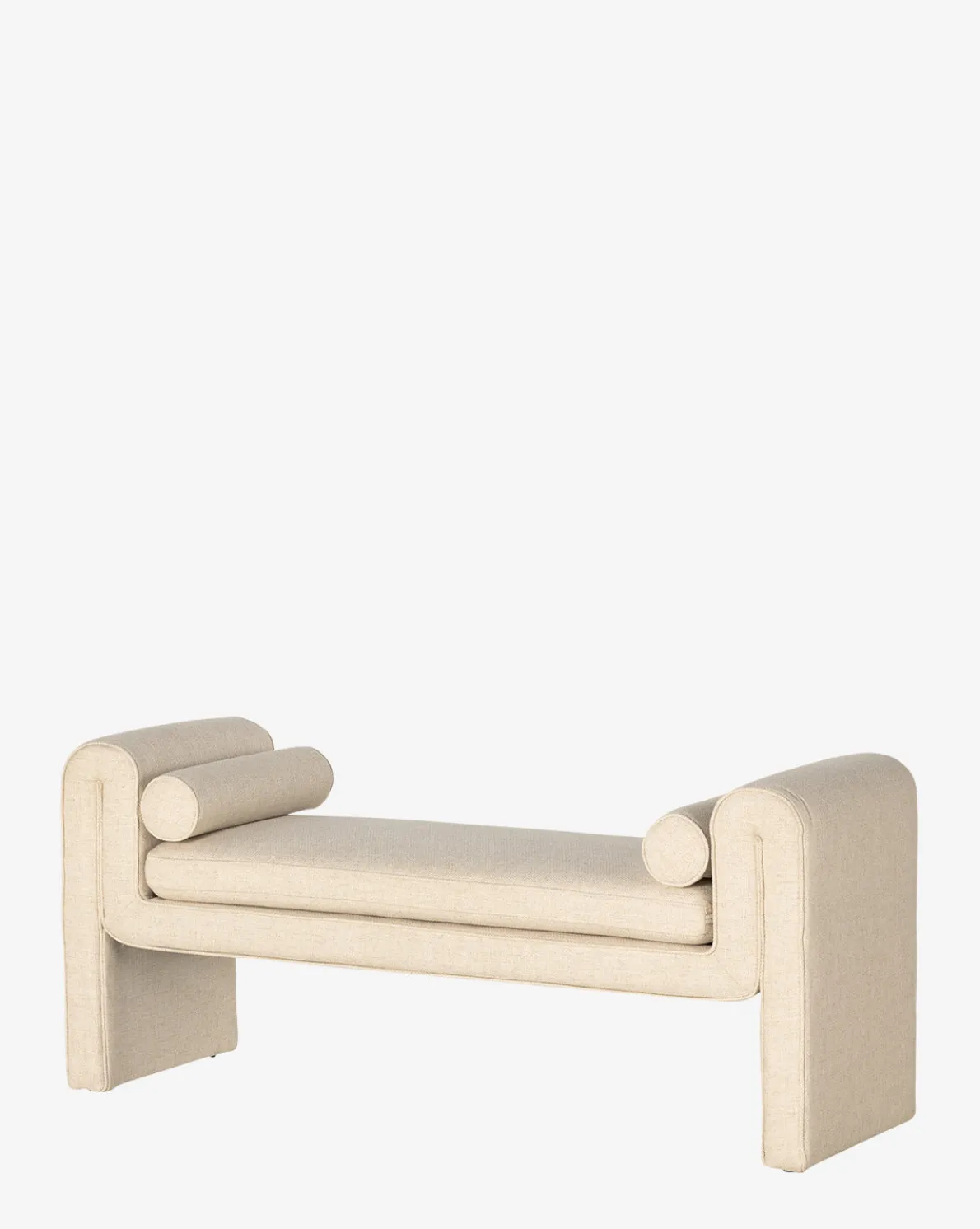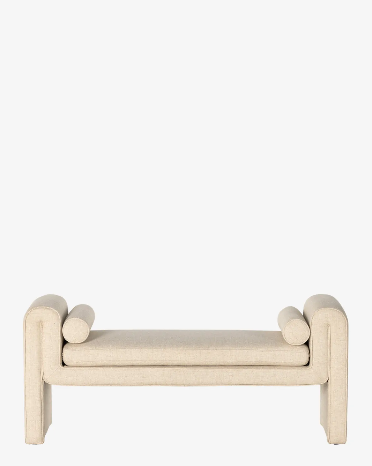 Inviting and modern, the Ashlyn Bench welcomes rest while seamlessly lending a playful feel to the home with its folded sides. With a long, cushioned seat and two cylindrical pillows, the bench is upholstered in either a camel cotton blend fabric or a cream performance fabric.