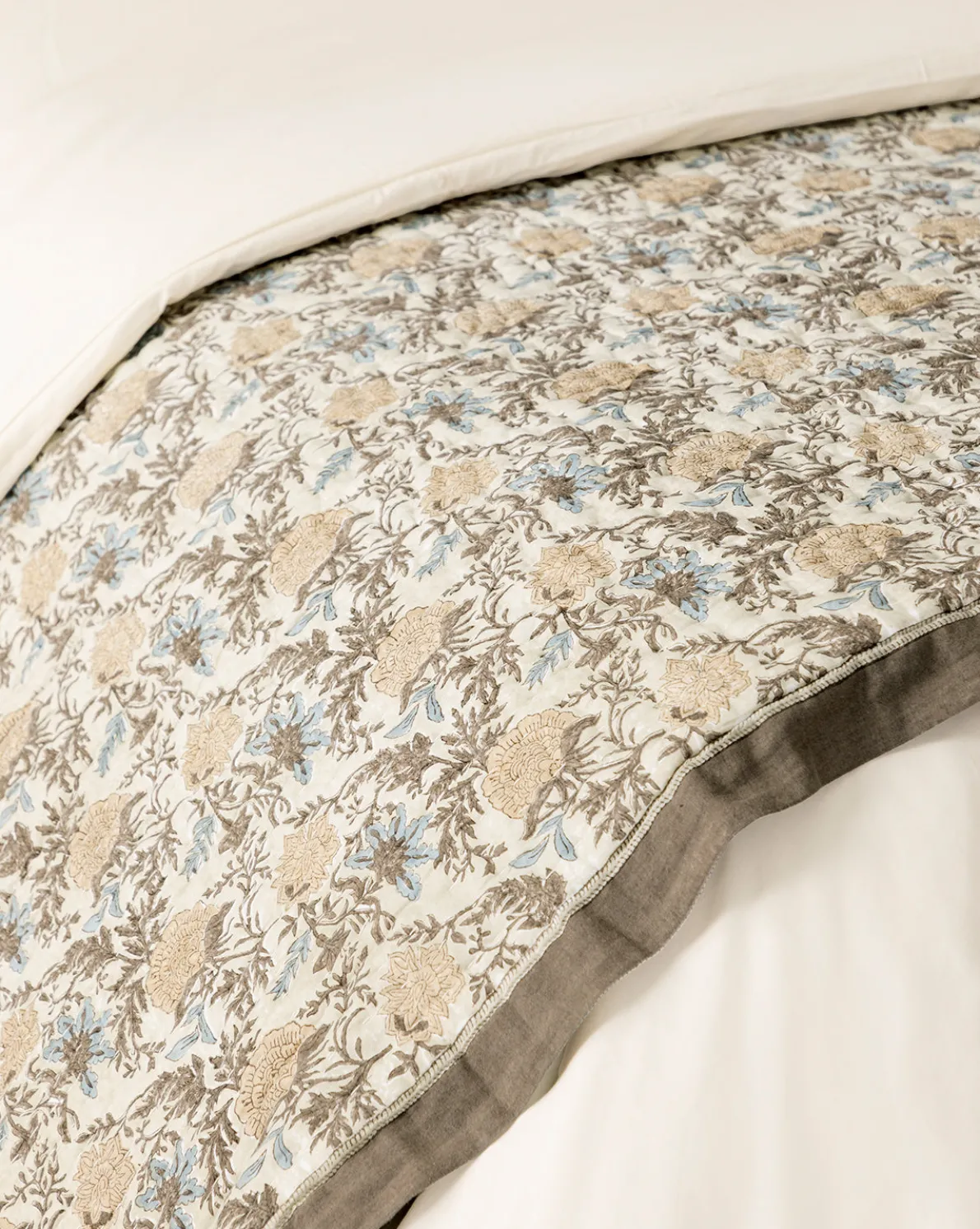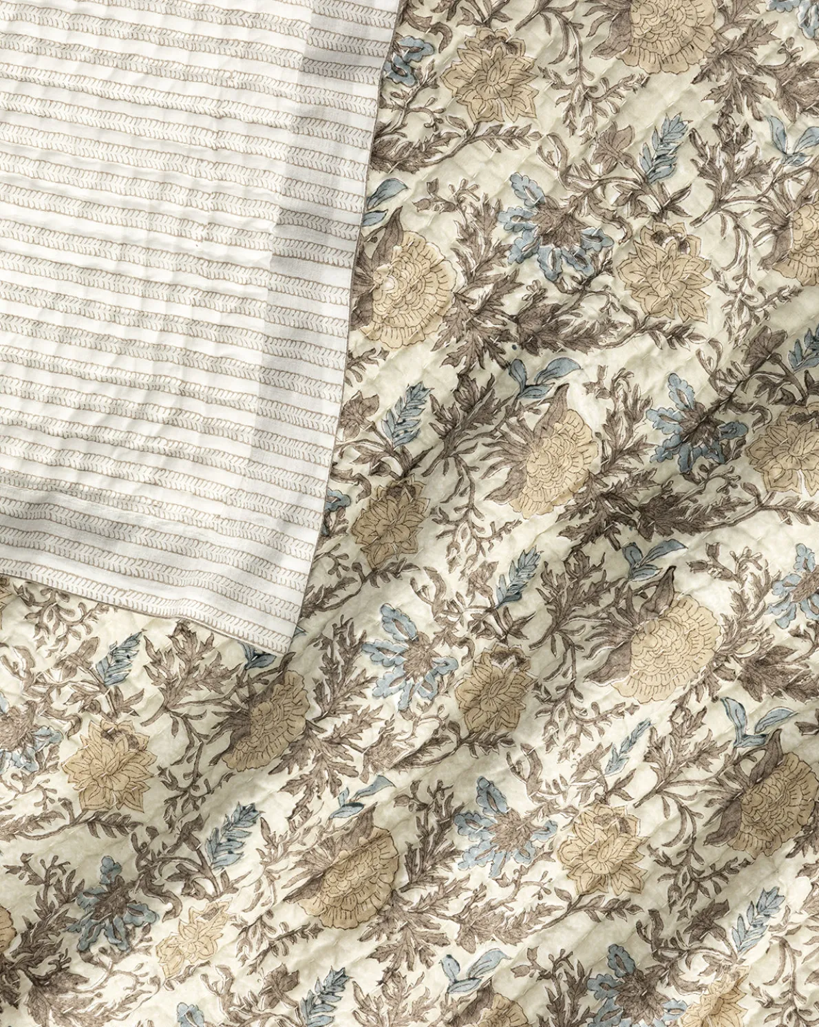 The Audrey Tan Block Print Quilt brings timeless charm to your bedroom with its delicate block print pattern in a neutral tan hue. Finished with soft ruffle edging, it layers beautifully to add extra warmth and visual interest, creating a collected, effortlessly inviting bed vignette.
