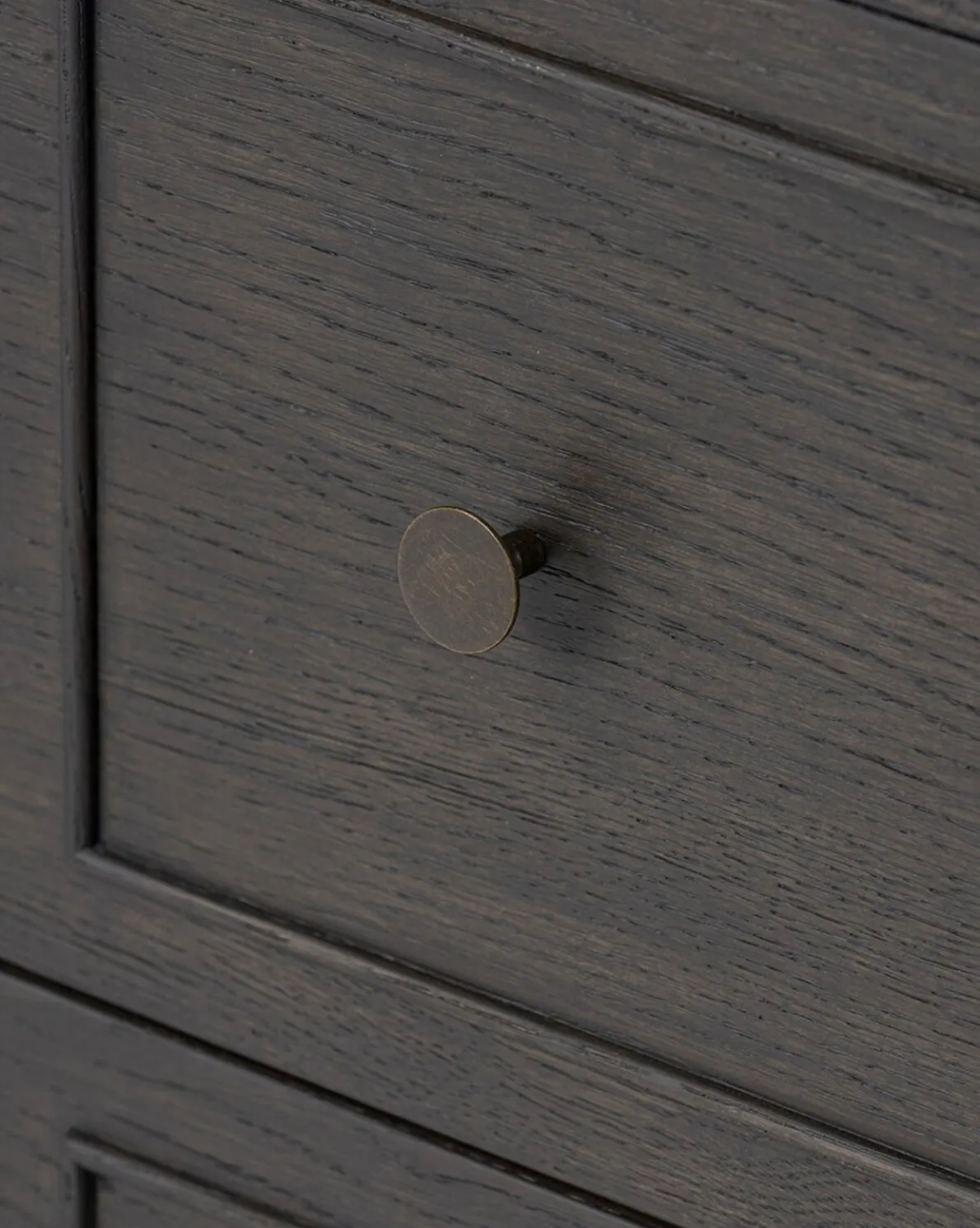 With a clean shape and generous storage space, the Aurelian 6 Drawer Dresser is as stylish as it is functional. Crafted from your choice of aged smoked oak or smoked black oak, this piece features slim tapered legs that provide a modest lift—lending to an elegant yet grounded presence in your home.