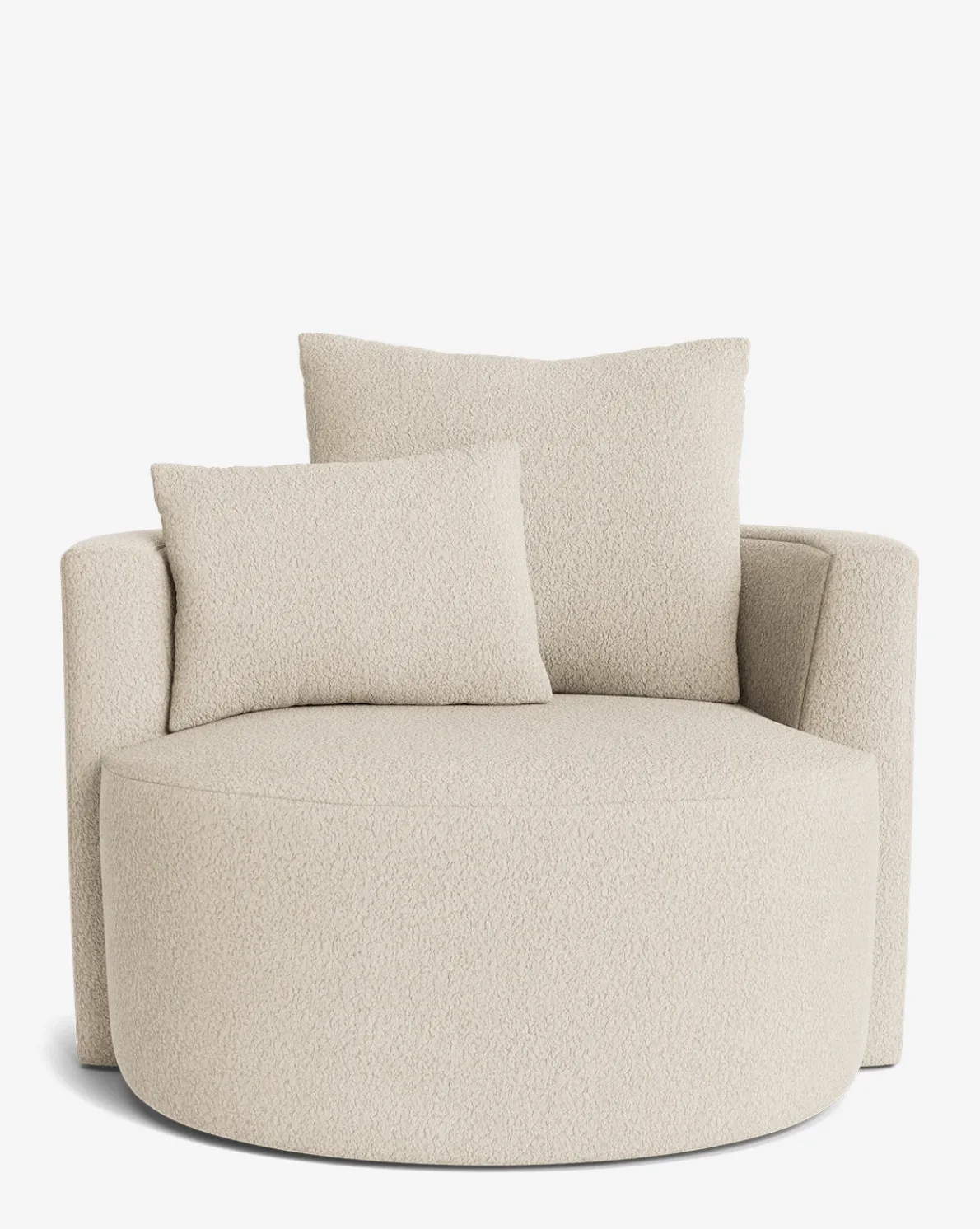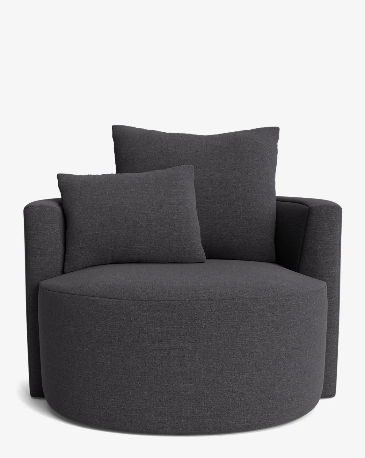 Balancing modern design with approachable comfort and designer details, our Banbury Upholstered Swivel Chair was designed with luxury in mind. Featuring feather blend cushions and pillows within its round structure, the swivel chair is full and inviting. The chair is customizable in a wide array of fabrics, allowing you to personalize your space.