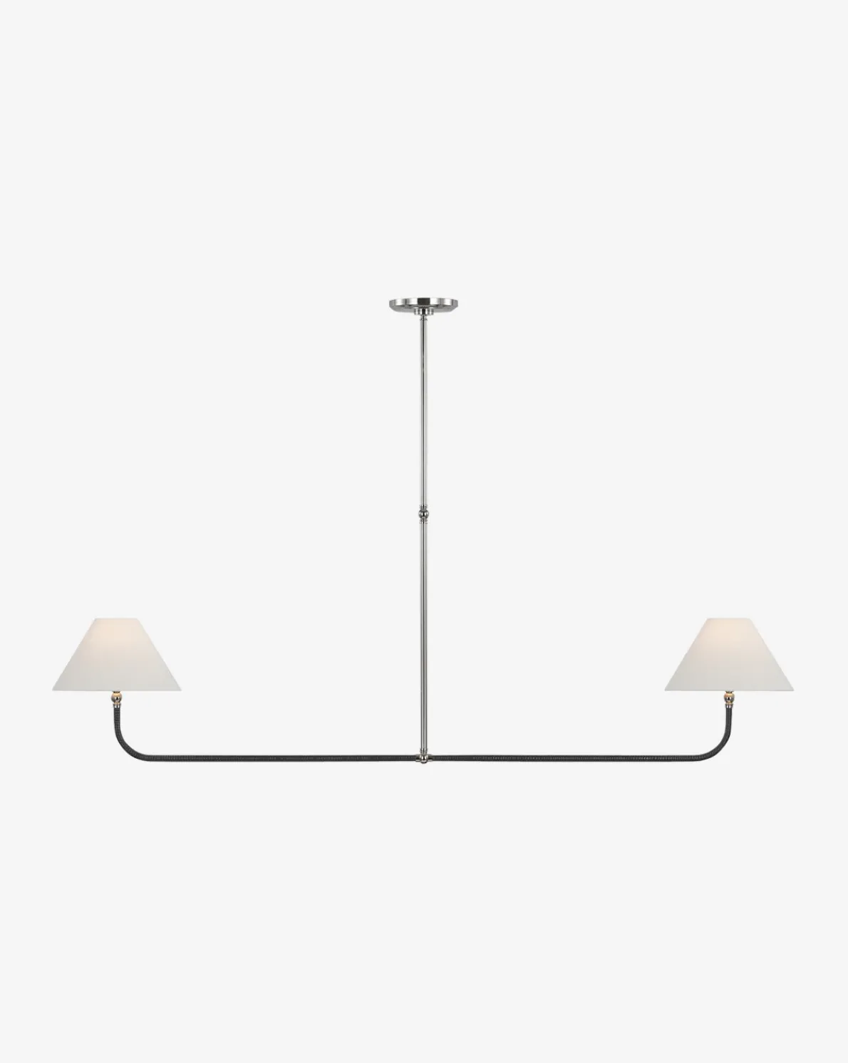 With tapered white linen shades to complement the shapely arms of its structure, the Basden Extra Large Linear Chandelier brings modern refinement to your decor. Rattan wraps around the arms of the chandelier as an organic element to lend texture and approachability.