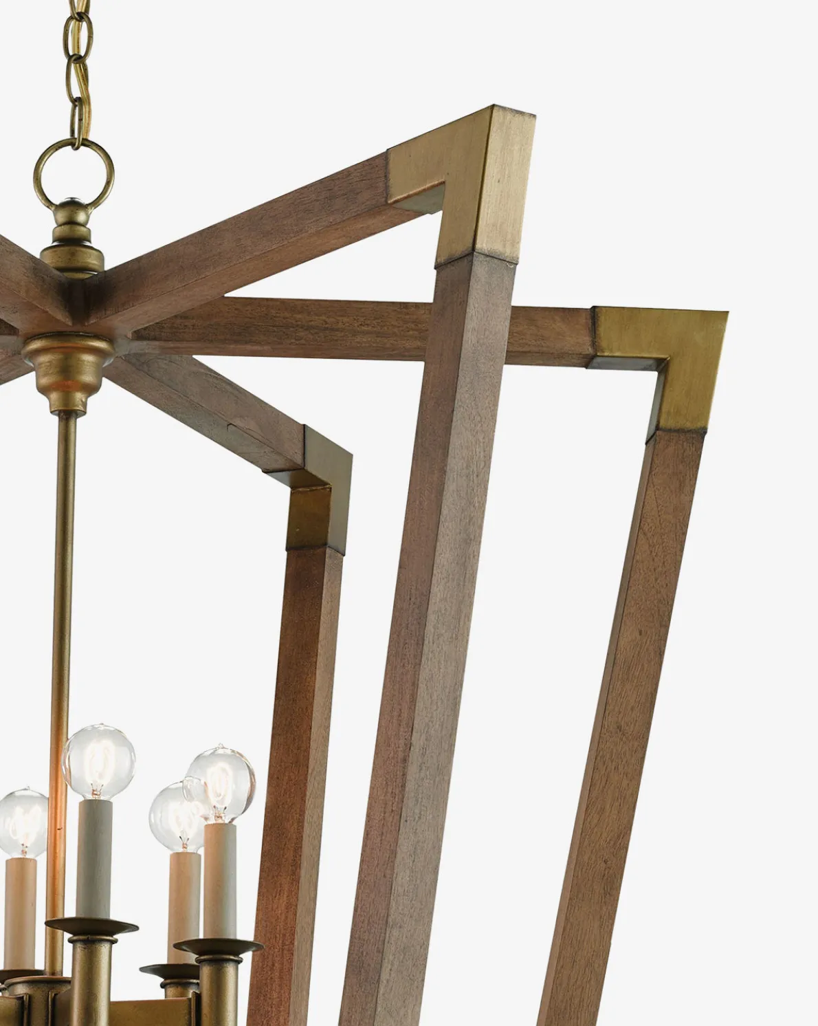 The Bastian Chandelier brings modern form to traditional cage lighting. Its interesting form is made with chestnut and brass corners, set to highlight the three-light fixture it houses.