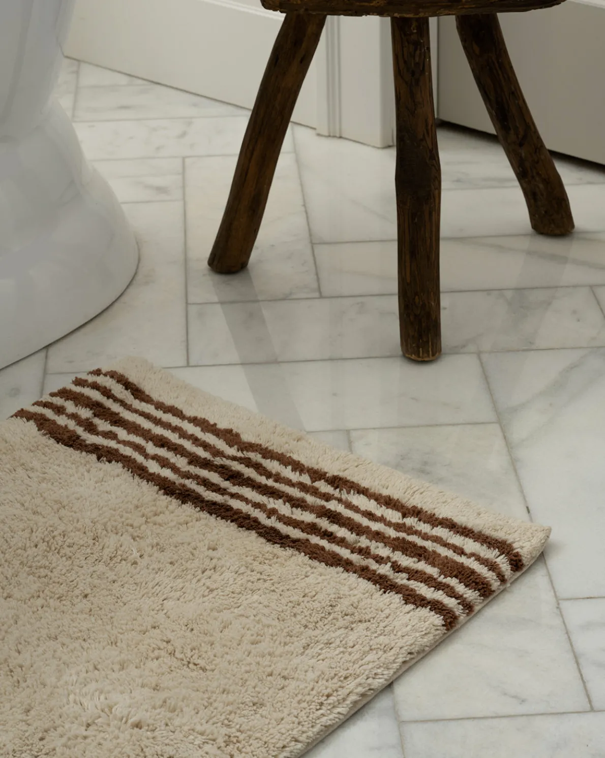 Soft and welcoming, the Beata Bath Mat is made from 100% cotton pile. The bath mat will suit a neutral bathroom with its cream coloring and brown stripes at each edge. The mat is both plush and simply designed, making it a soothing addition to your space.