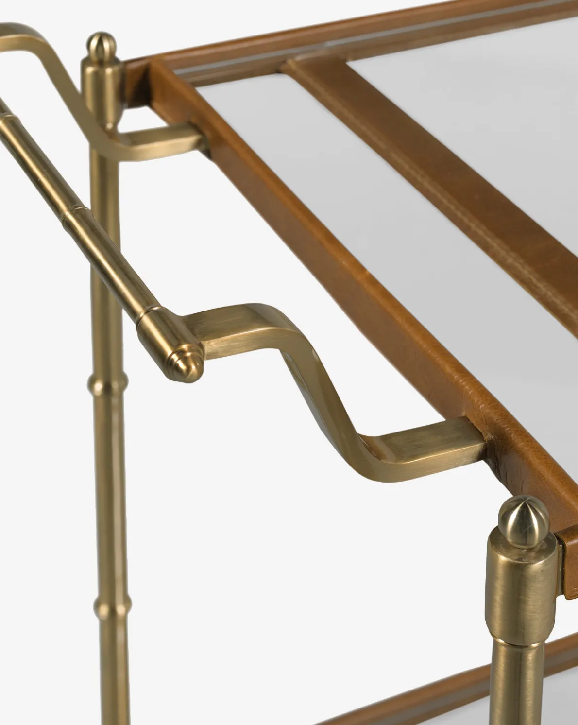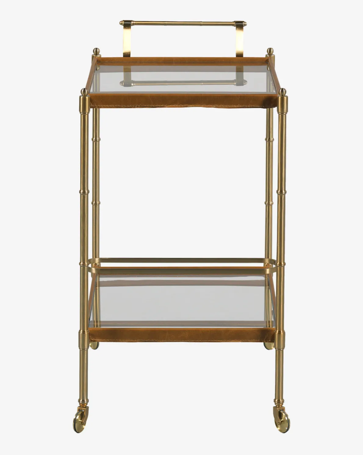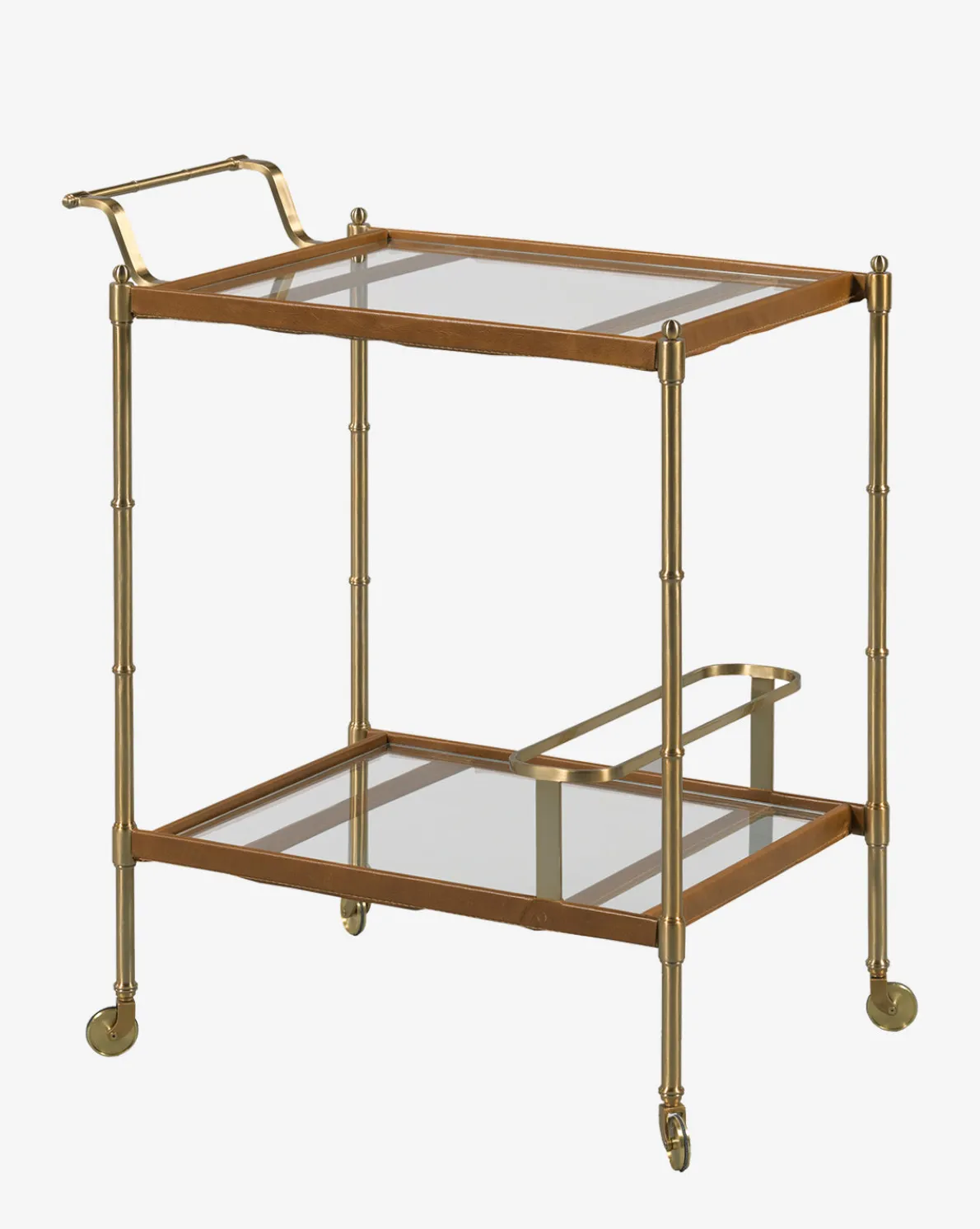 Inspired by bar carts from the English Regency, the Bexley Bar Cart is sleek and thoughtfully designed. Its brass frame features leather accents to hold the tempered glass shelves. Complete with functional details, this bar cart is a beautiful addition to your hosting set up.