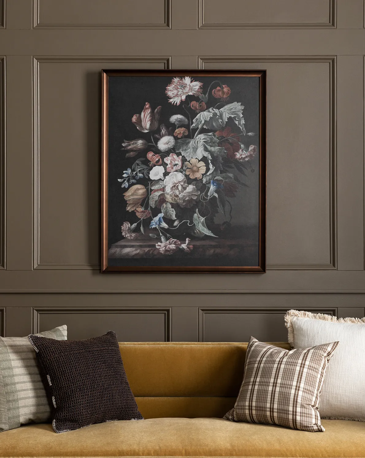 Elegant and moody, Botanical Renaissance brings beauty to your space in the form of a lush vase of flowers contrasted against a dark background. Presented within a bronze-finished frame, this piece brings gallery-quality materials to your decor.