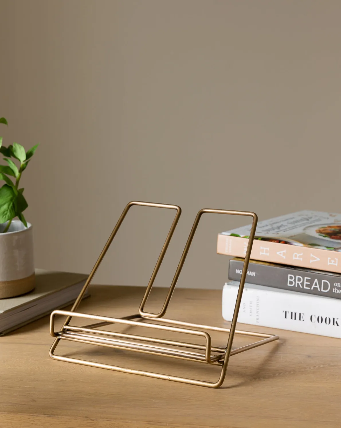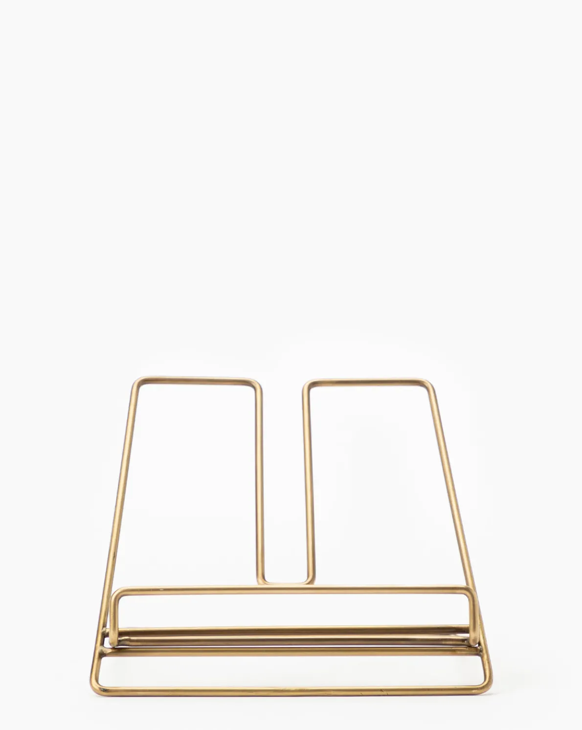 The unique shape of this modern Brass Cookbook Holder gives presence to countertops even when it isn’t holding a book. Its clean lines and slender metal silhouette are pronounced yet simple, adding both purpose and a refined style to your kitchen.