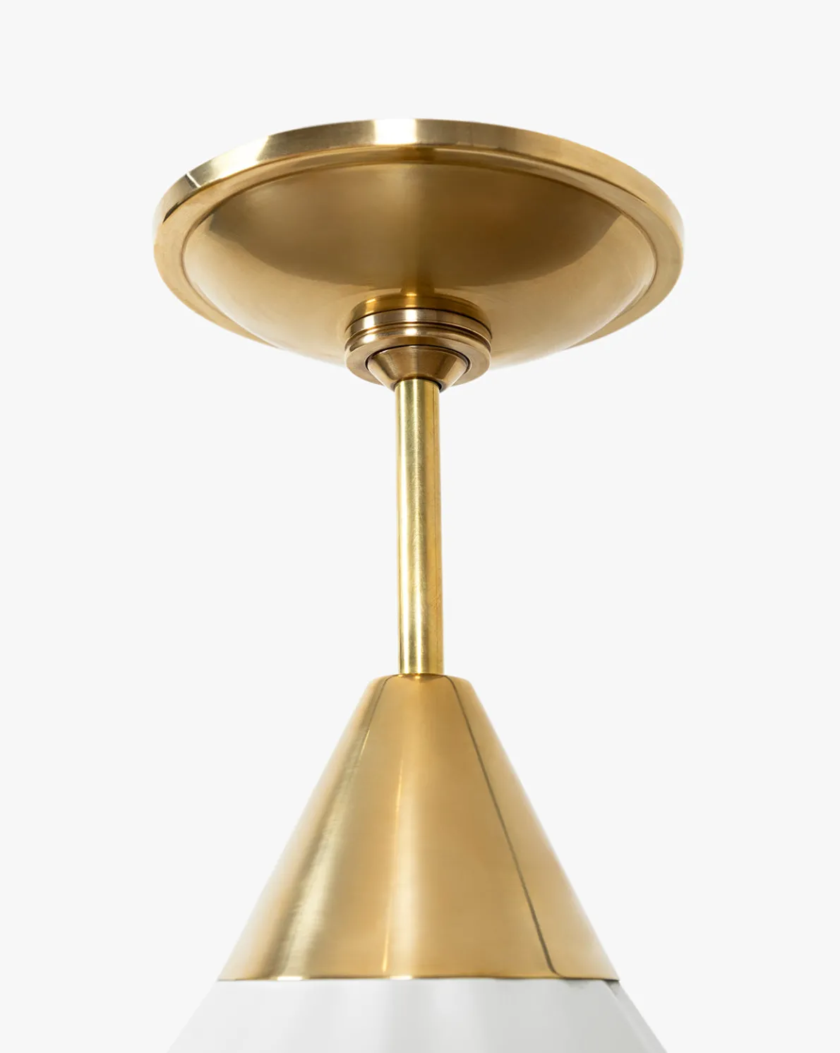 Bold and elegant, our Brigadier Flush Mount brings new light to a vintage-inspired design. It is beautifully crafted with durable shades that are constructed from metal and an off-white painted satin finish, and softly faceted with an antique brass cap detail. A simple chain balances the expressive form of the shades, adding sophisticated character to lighting designs throughout the home.