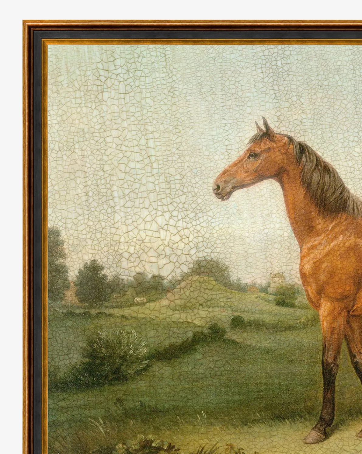 With a colorful composition, Brown Horse brings delicate detail to your space through an expressive portrait of a horse. Presented within a wood frame with an antique gold and black finish, the giclee print on canvas elevates and complements your decor.