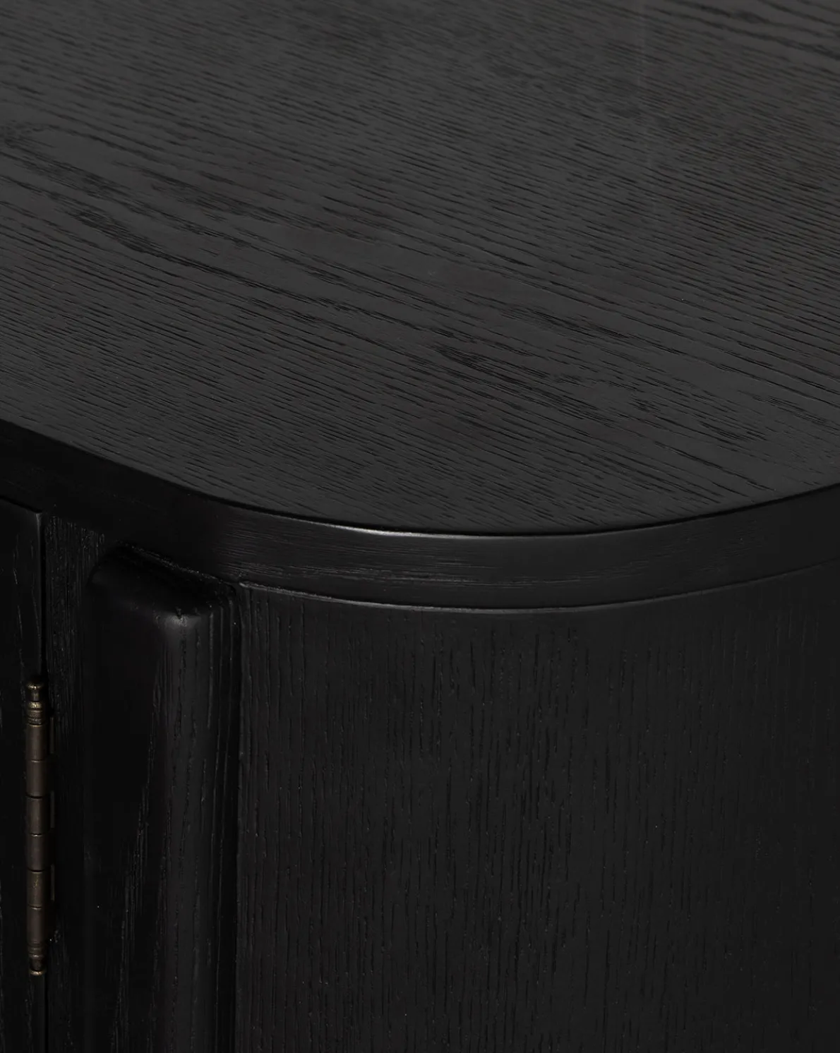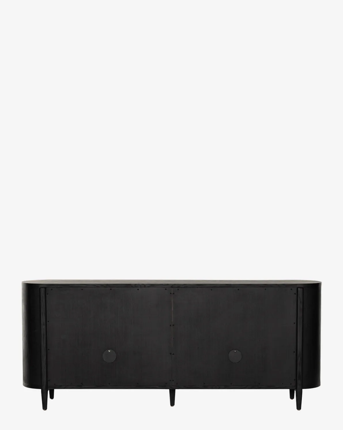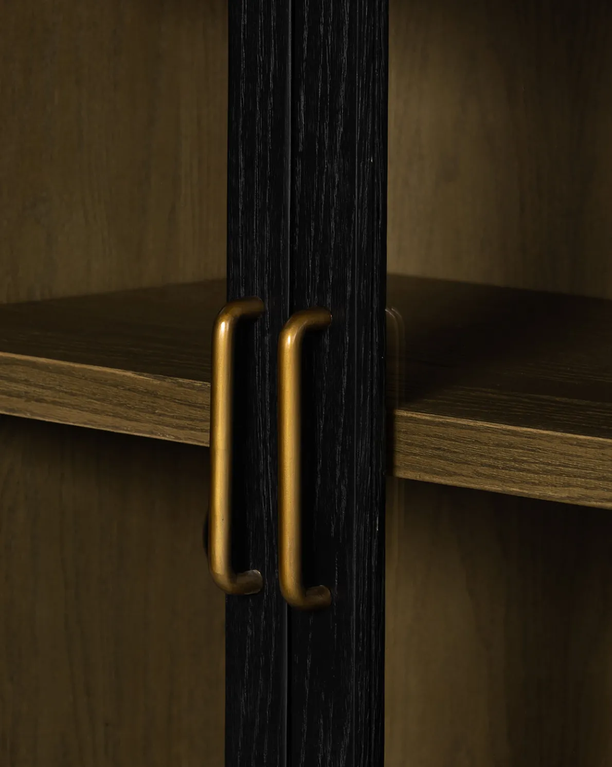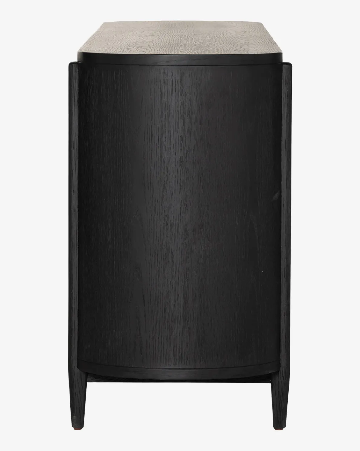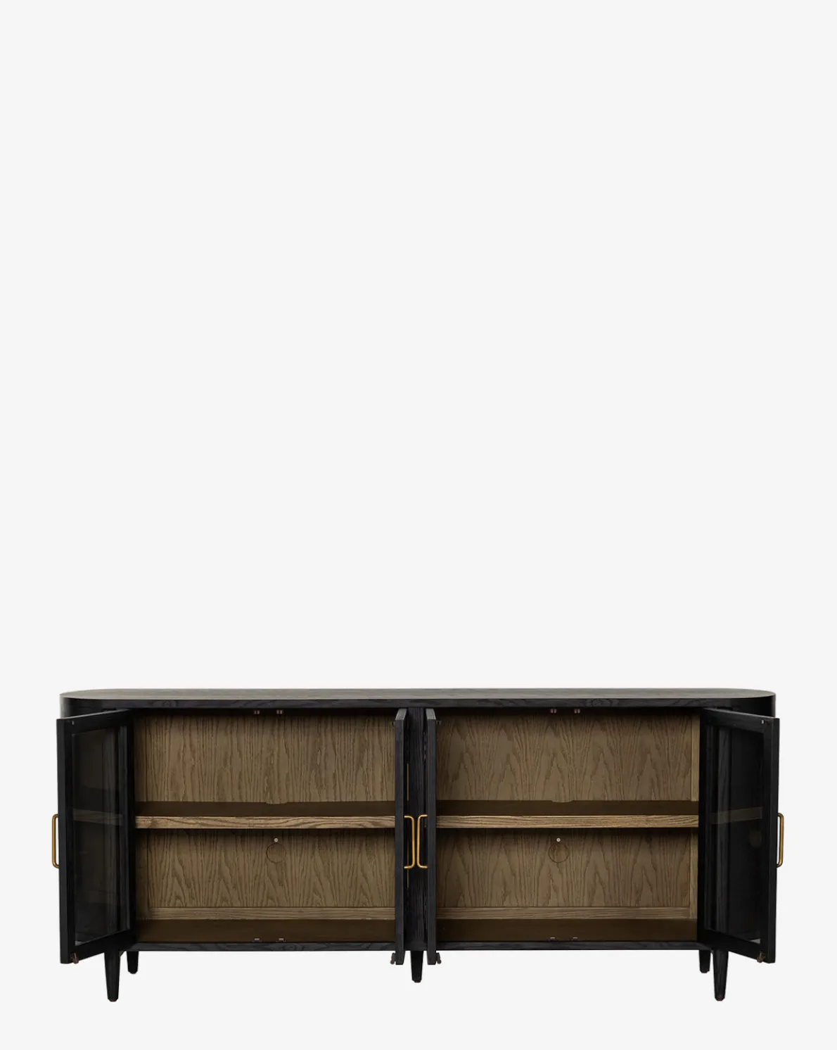 The Burton Sideboard shows the beauty of oak through a drifted black exterior with convex ends. Glass doors add to the material mix while allowing you to see the beautiful contrast of its lighter interior shelves and anything displayed inside.