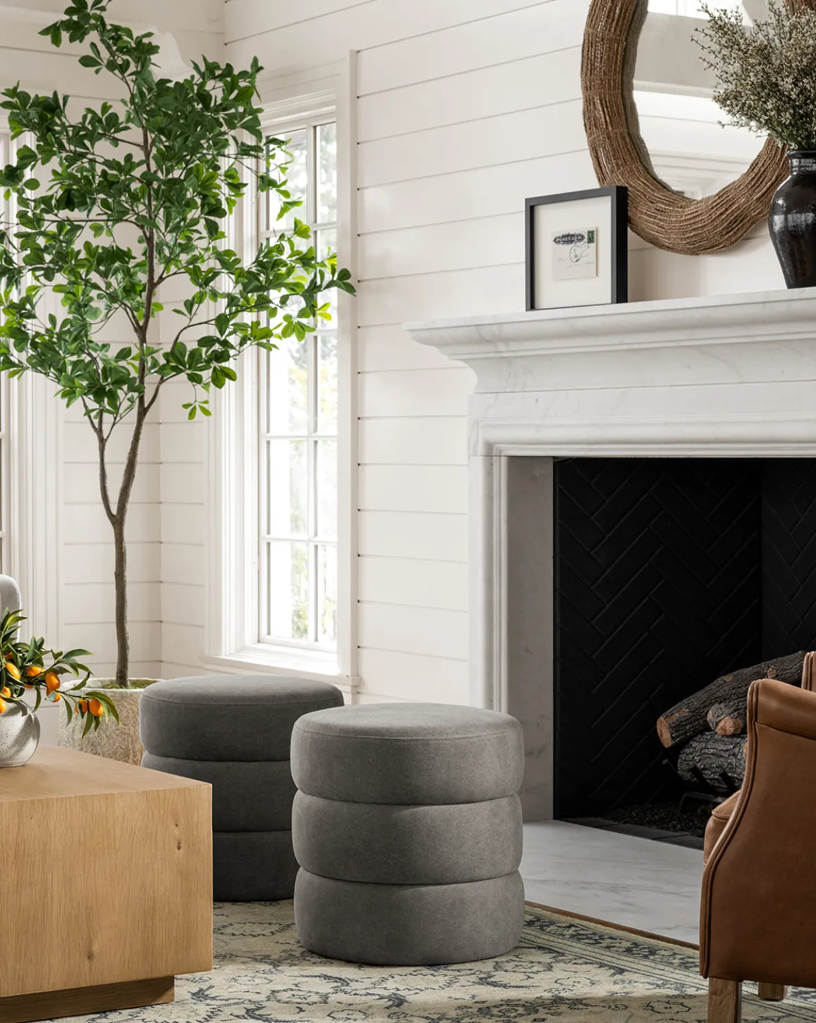 The Channel Ottoman has a sophisticated, cylindrical form and quilted feel. Its form is slender and structured, a unique design that gives a subtle nod to midcentury styles.
