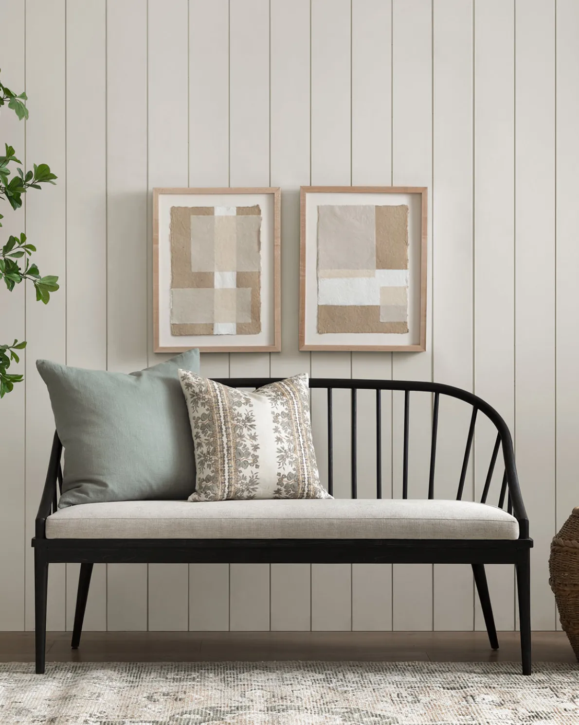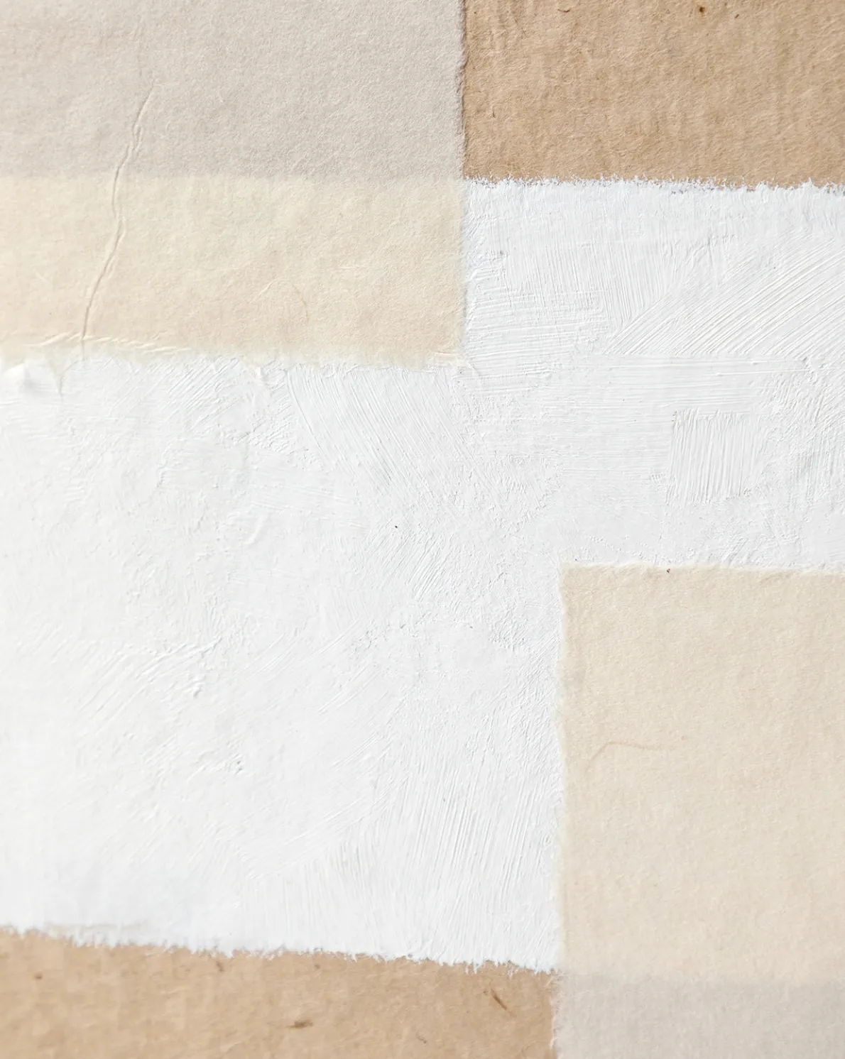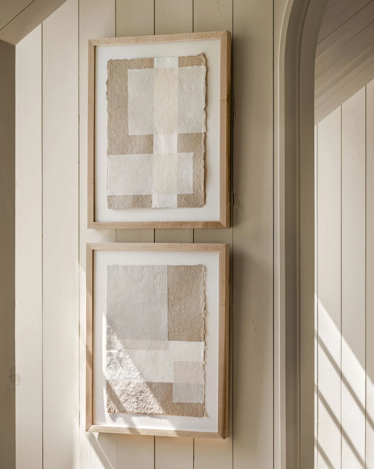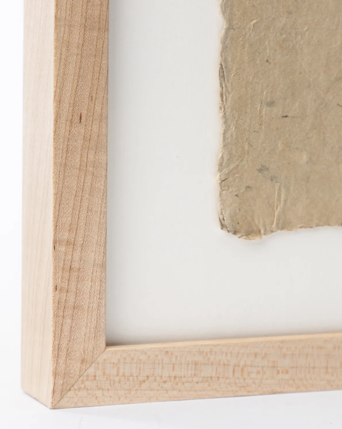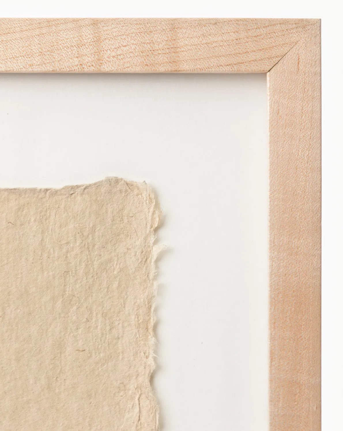 Neutral and textural, Collage 1 is a study in composition. Its simple palette allows the texture of the handmade paper to shine, while highlighting the creativity of the piece. Presented within a maple wood frame, this piece brings a uniquely dimensional feel to vignettes or wall treatments.