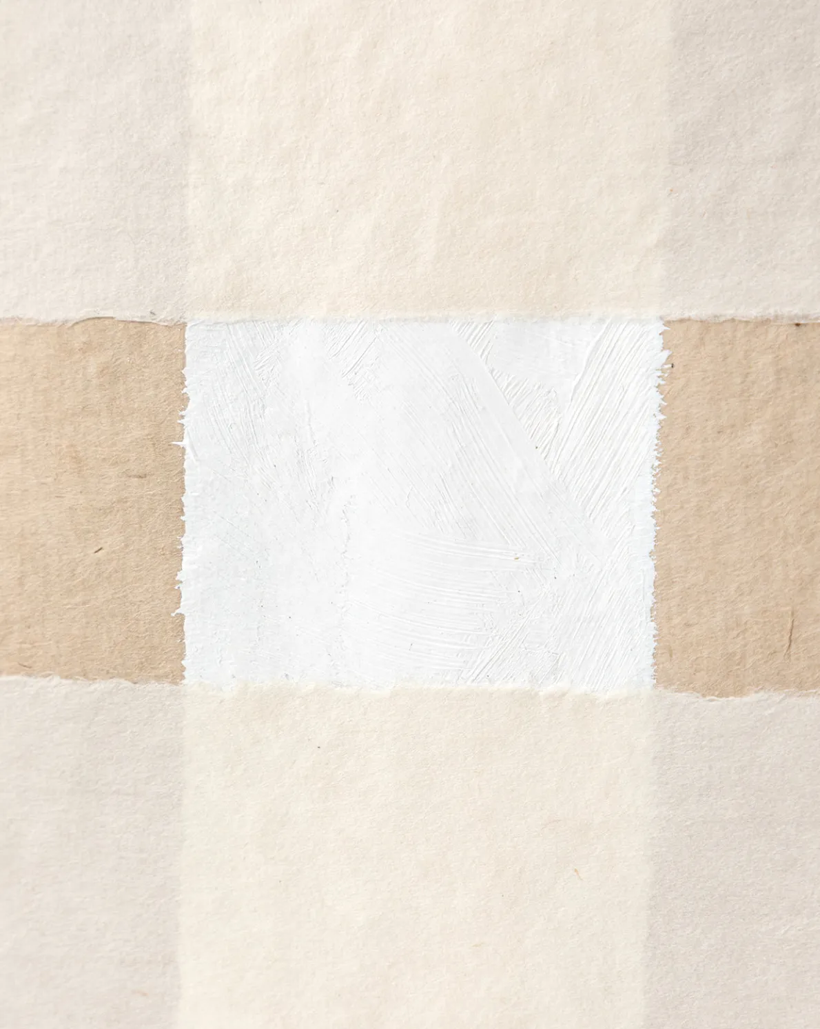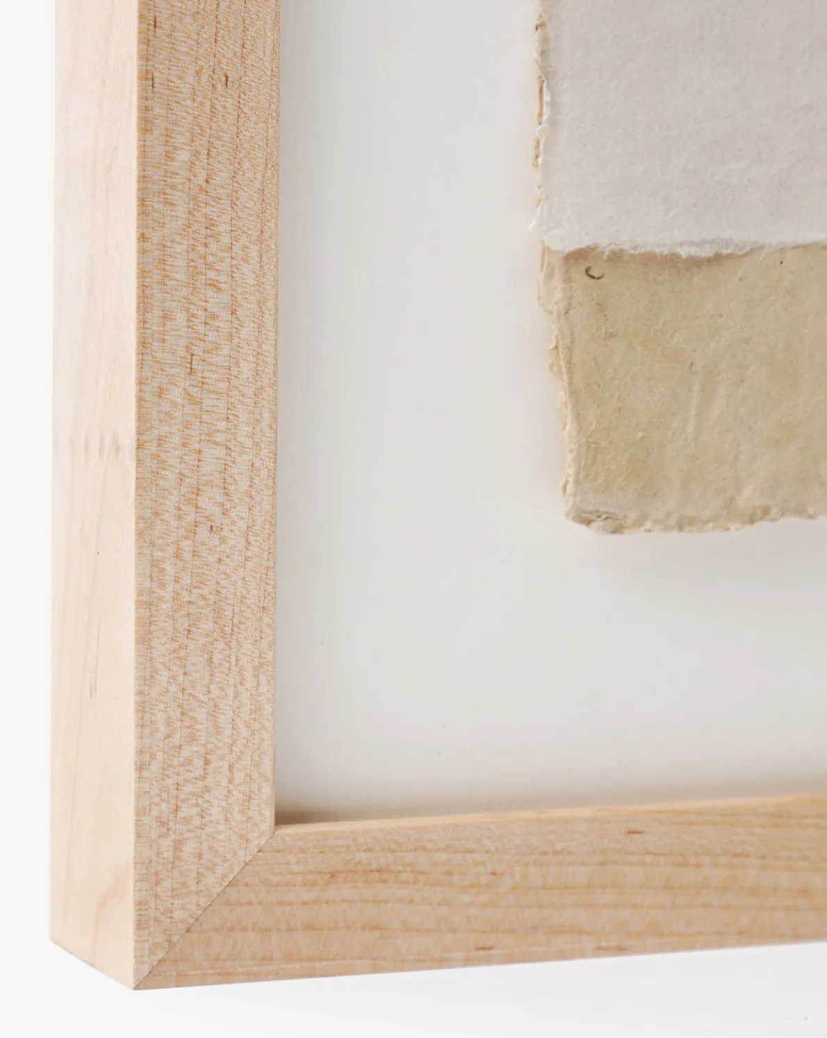 Neutral and textural, Collage 2 is a study in composition. Its simple palette allows the texture of the handmade paper to shine, while highlighting the creativity of the piece. Presented within a maple wood frame, this piece brings a uniquely dimensional feel to vignettes or wall treatments.