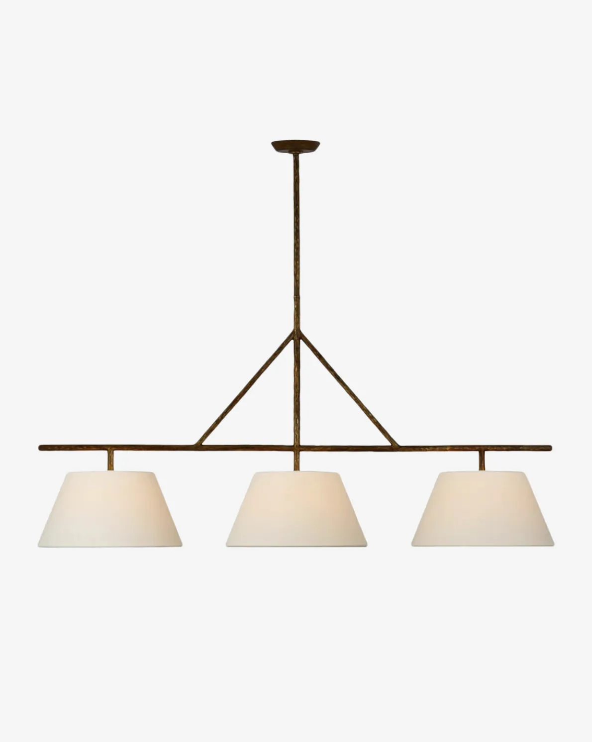 With notes of both traditional and modern design, the Collette Linear Pendant instantly draws the eye with its unique combination of design styles. Its streamlined frame is finished in either Gilded Iron, or Aged Iron, perfectly complementing your space, while three traditional linen shades cast a soft glow wherever it’s placed.