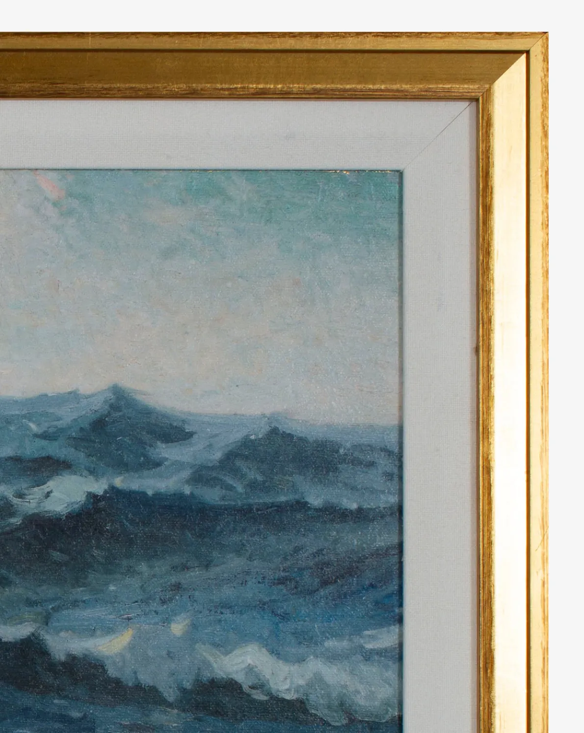 With moody tones and fine brushwork, Deep Blue Waters depicts a stormy sea. Captivating and dramatic, the piece displays a canvas transfer technique, allowing for gallery-quality artwork in your home, framed with gold wood.