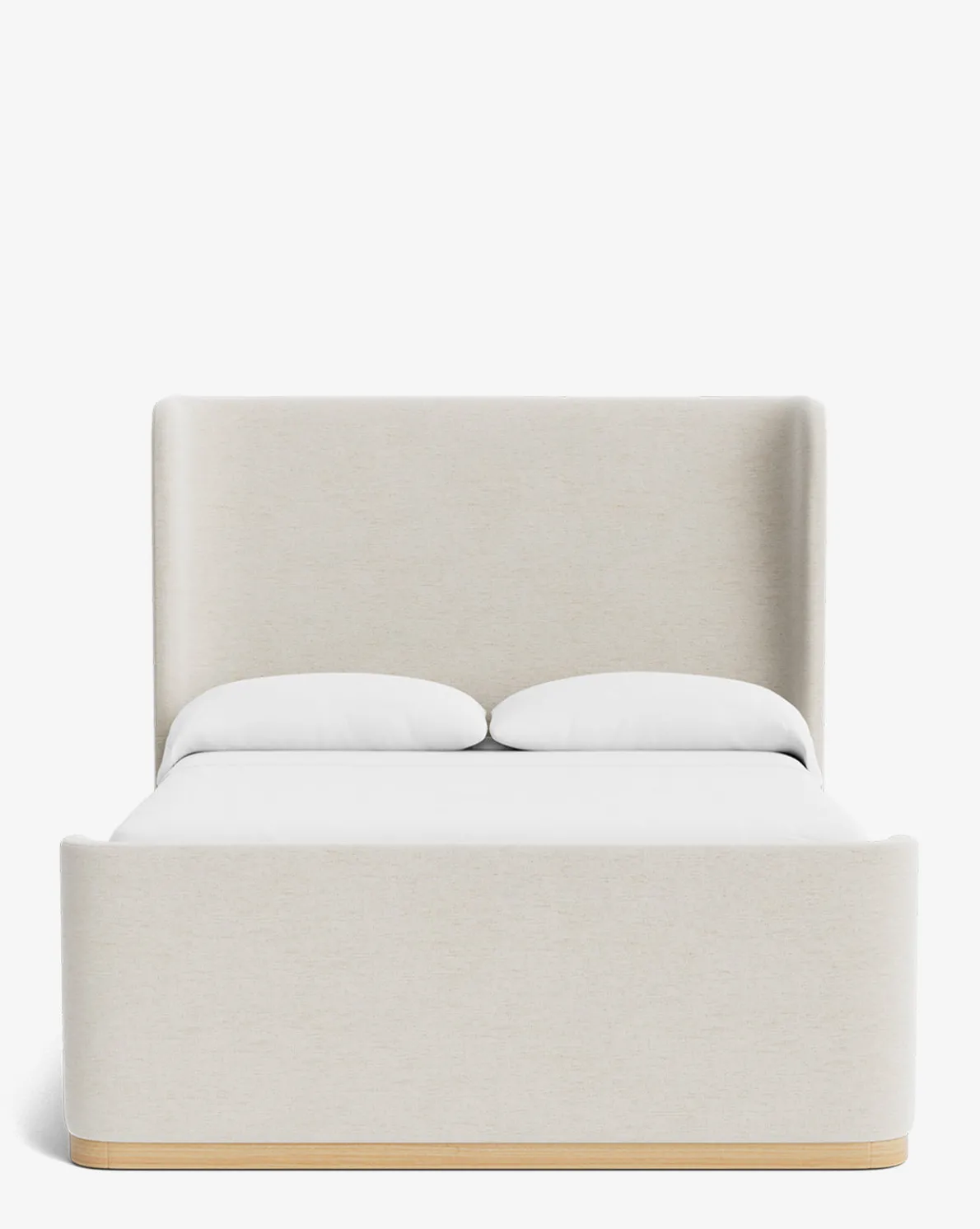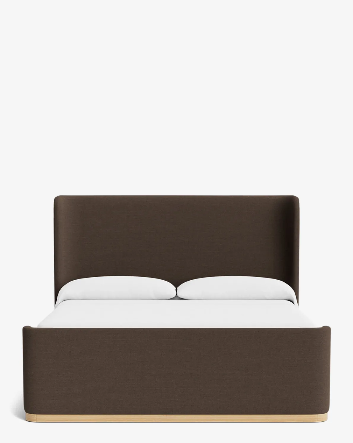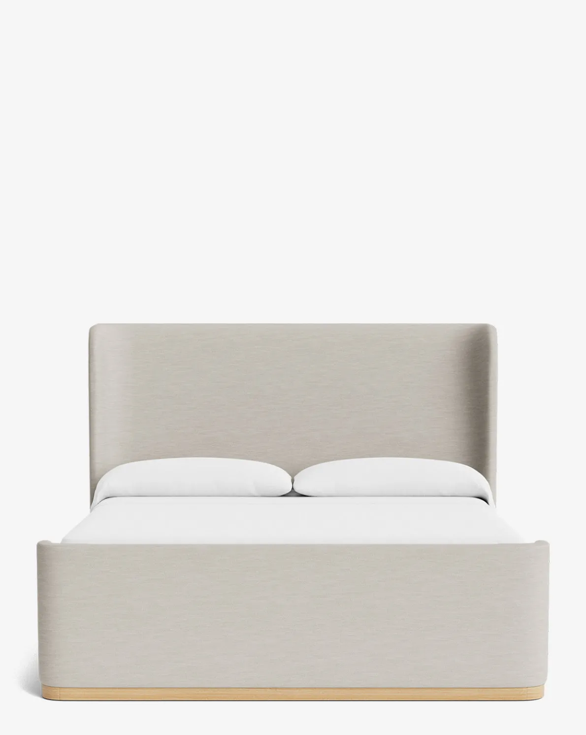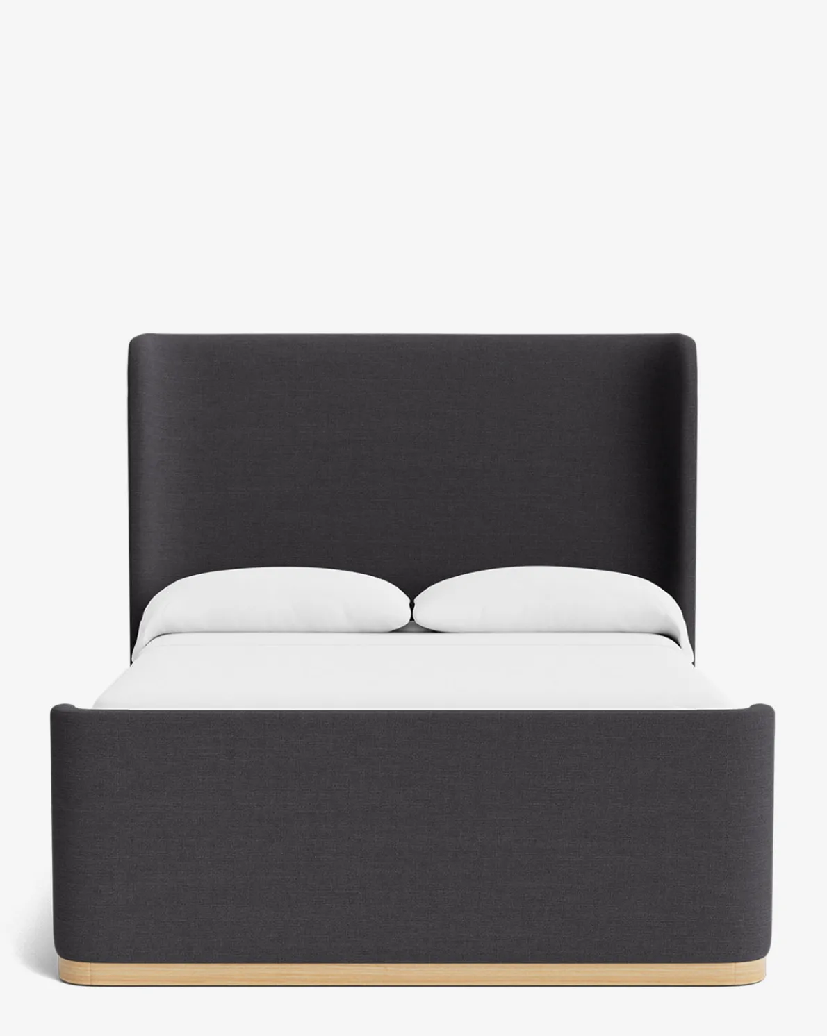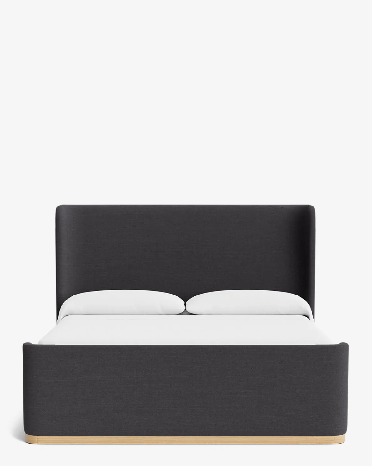 In a solid wood frame with foam padding, the Denning Upholstered Bed is customizable with our selection of high-end upholstery fabrics. Its frame is simple, with subtle curvature on the headboard and footboard to create an inviting design. Complete with a wood base, the Denning Upholstered Bed brings versatility and elegance to your bedroom.