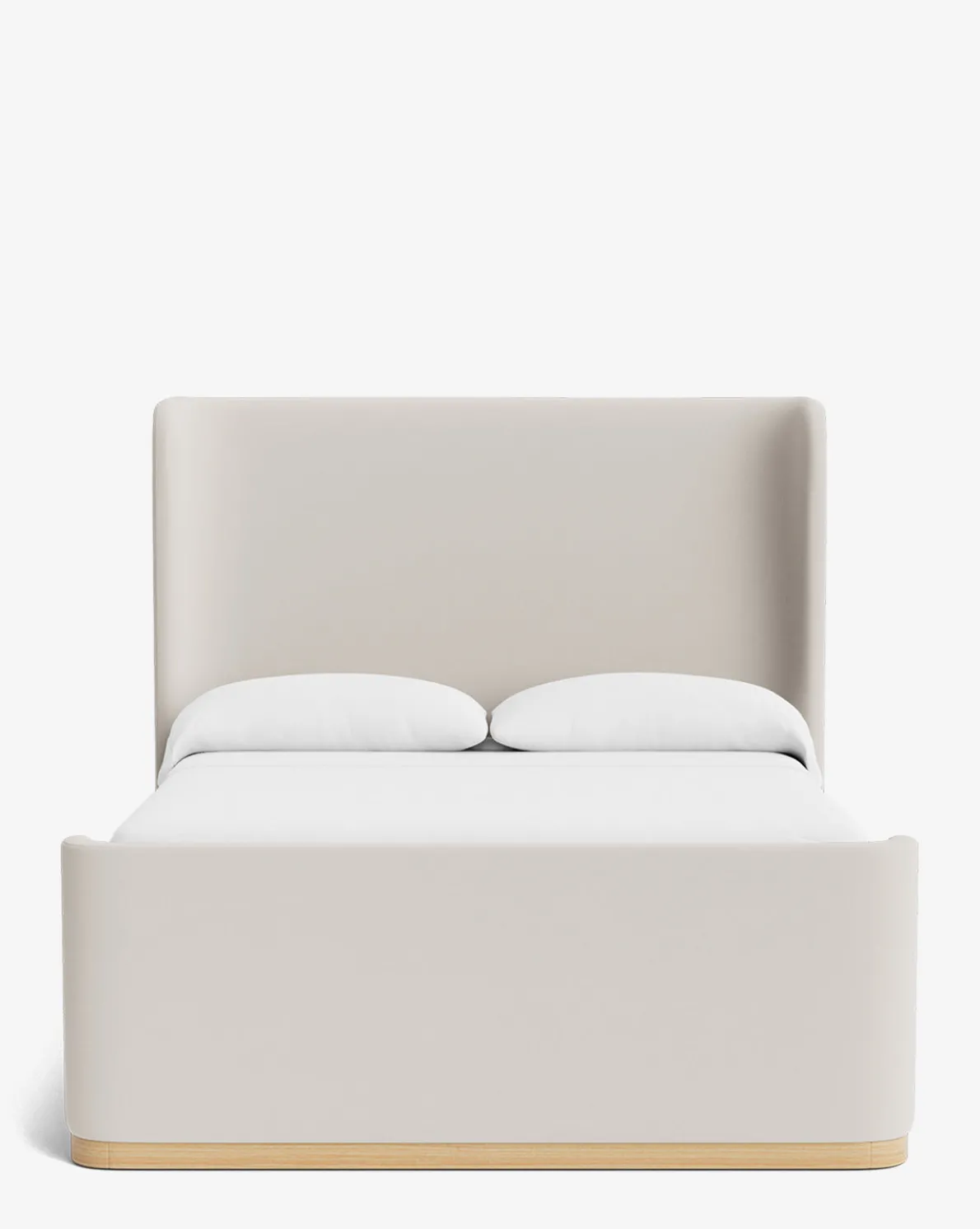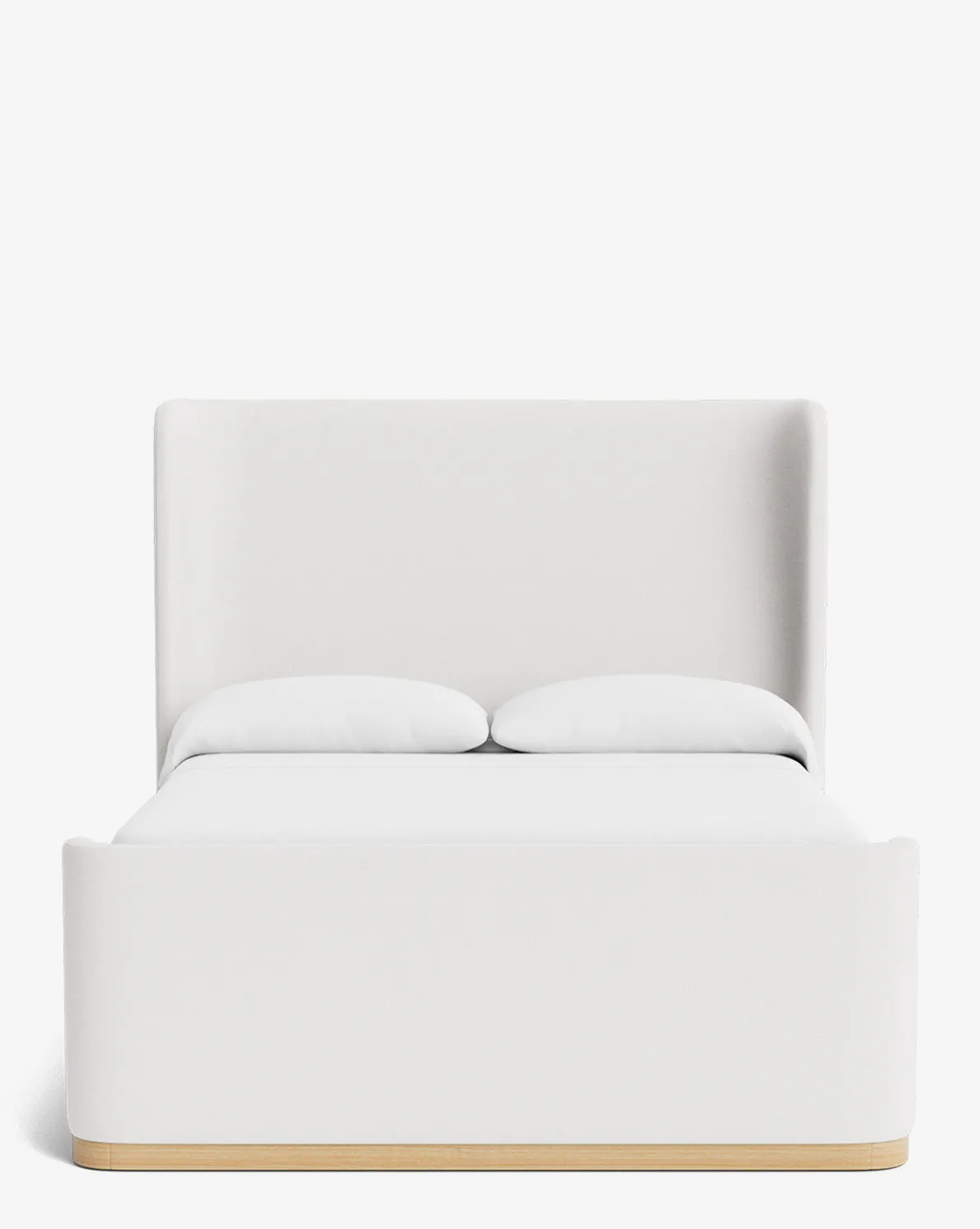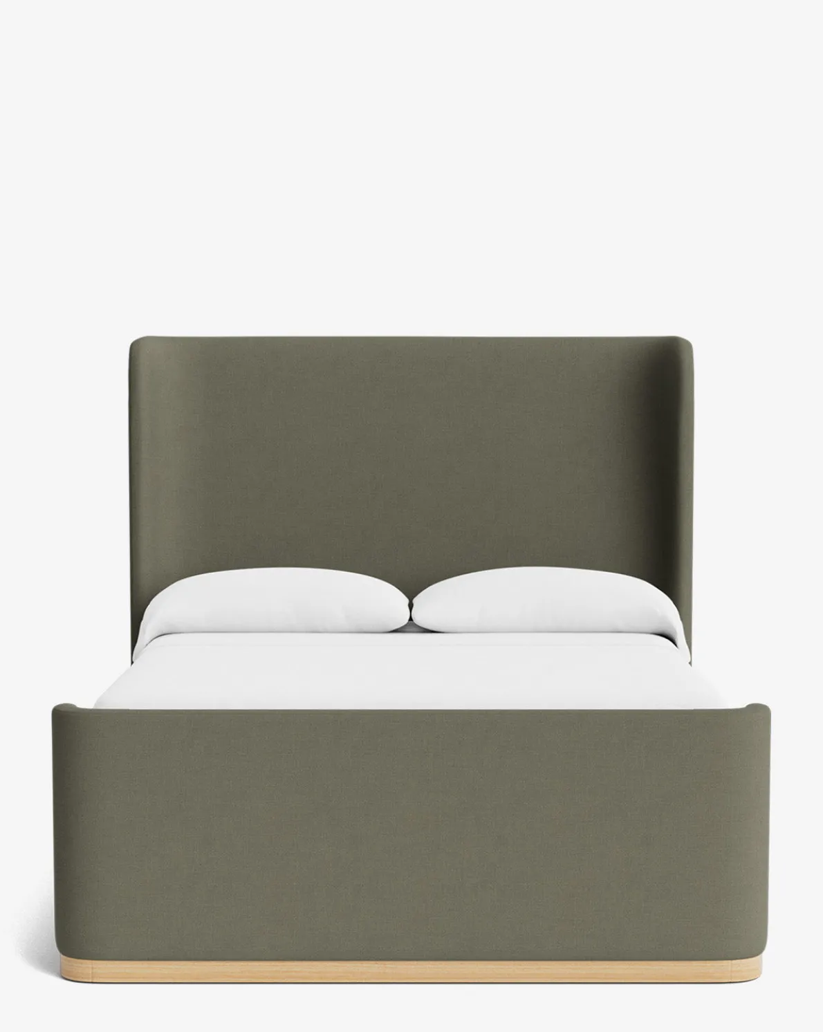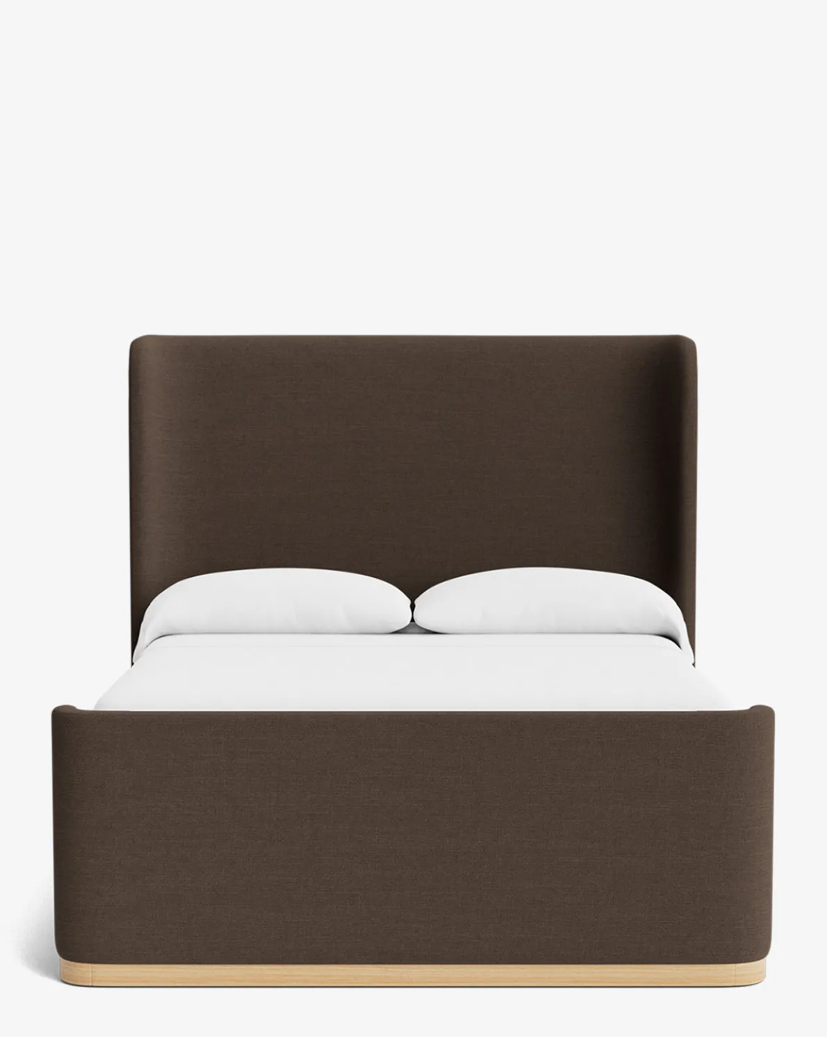 In a solid wood frame with foam padding, the Denning Upholstered Bed is customizable with our selection of high-end upholstery fabrics. Its frame is simple, with subtle curvature on the headboard and footboard to create an inviting design. Complete with a wood base, the Denning Upholstered Bed brings versatility and elegance to your bedroom.