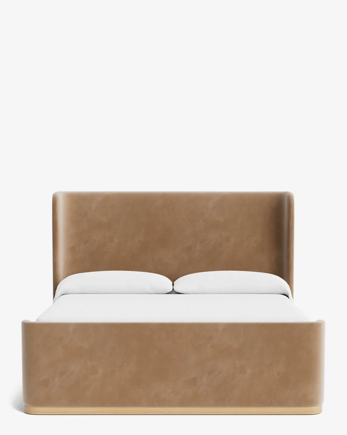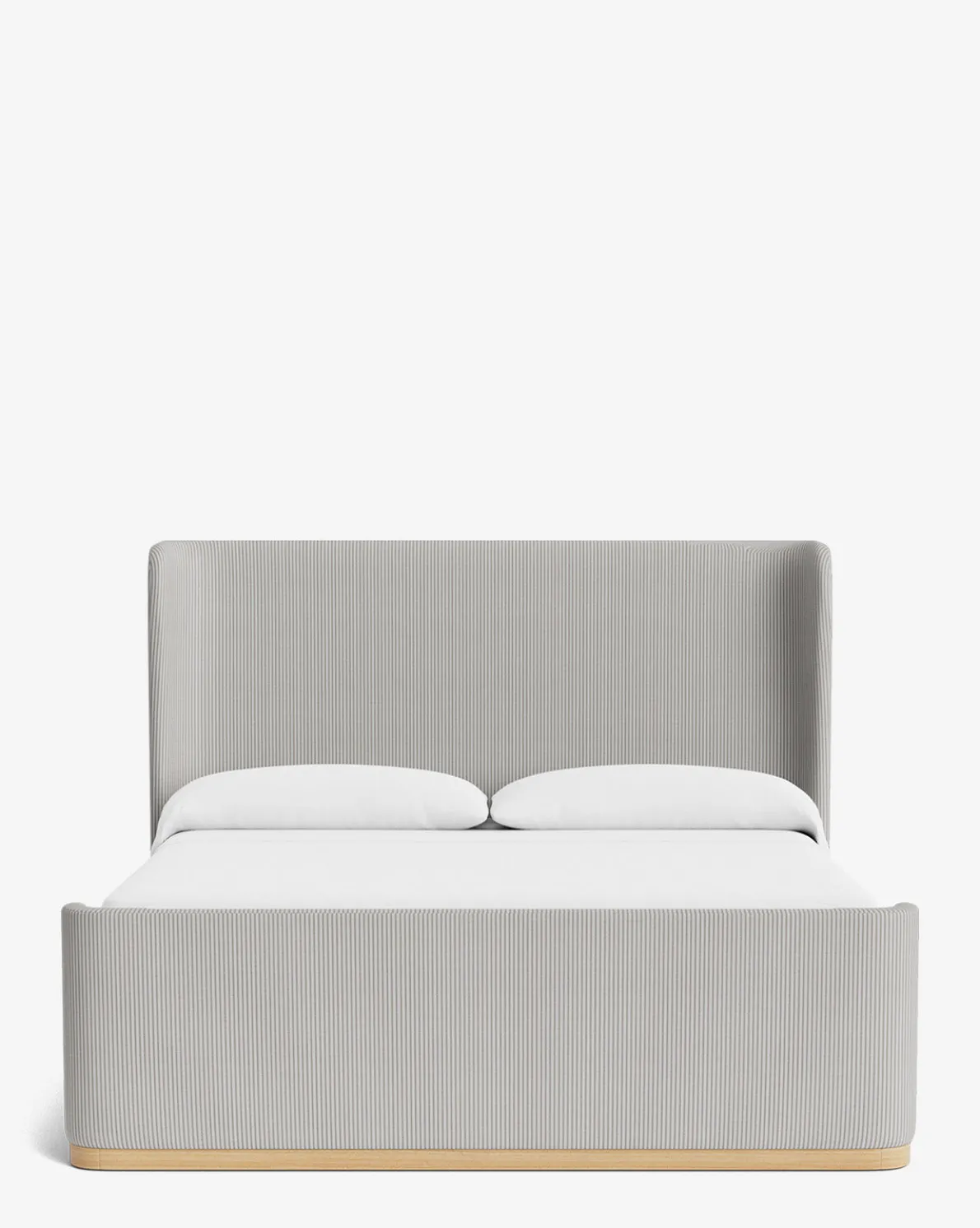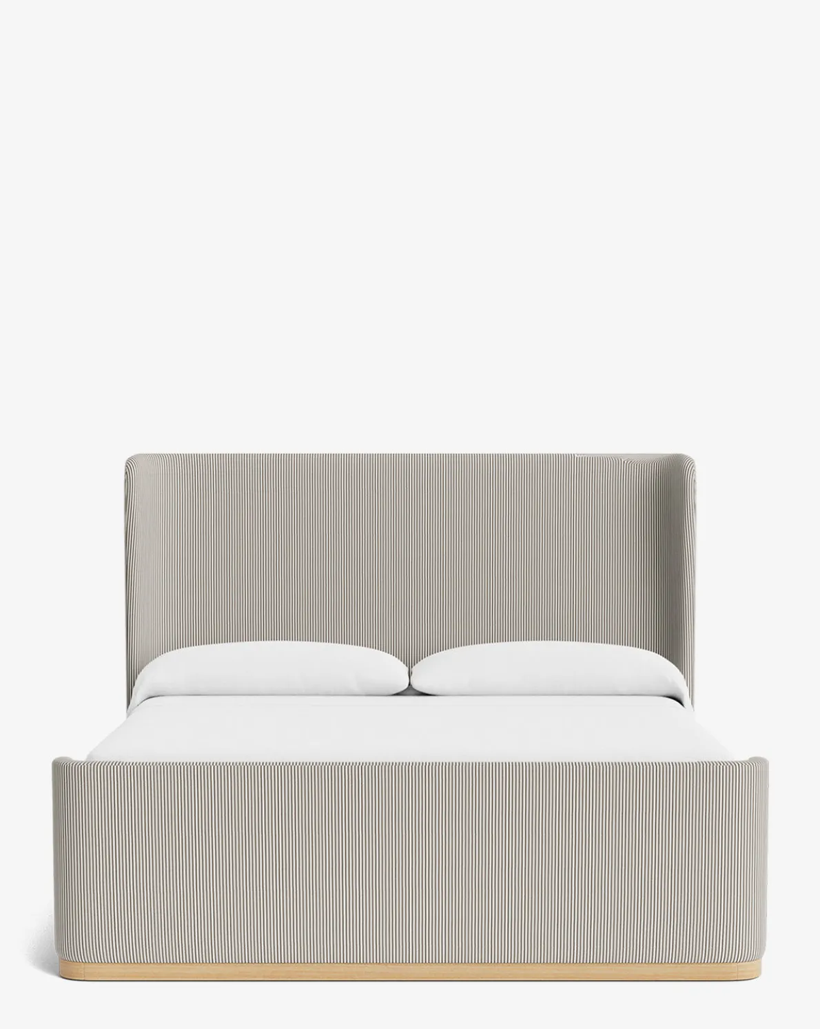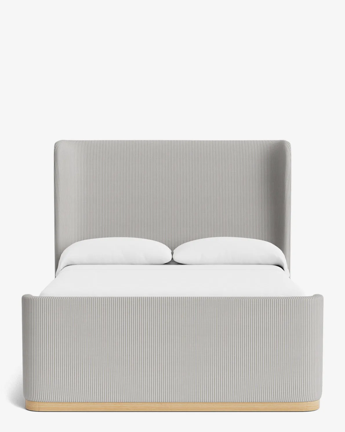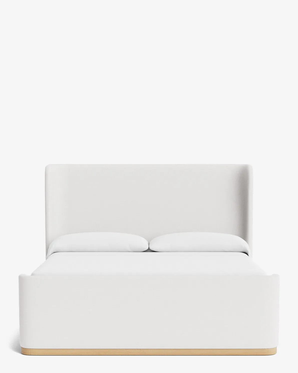 In a solid wood frame with foam padding, the Denning Upholstered Bed is customizable with our selection of high-end upholstery fabrics. Its frame is simple, with subtle curvature on the headboard and footboard to create an inviting design. Complete with a wood base, the Denning Upholstered Bed brings versatility and elegance to your bedroom.