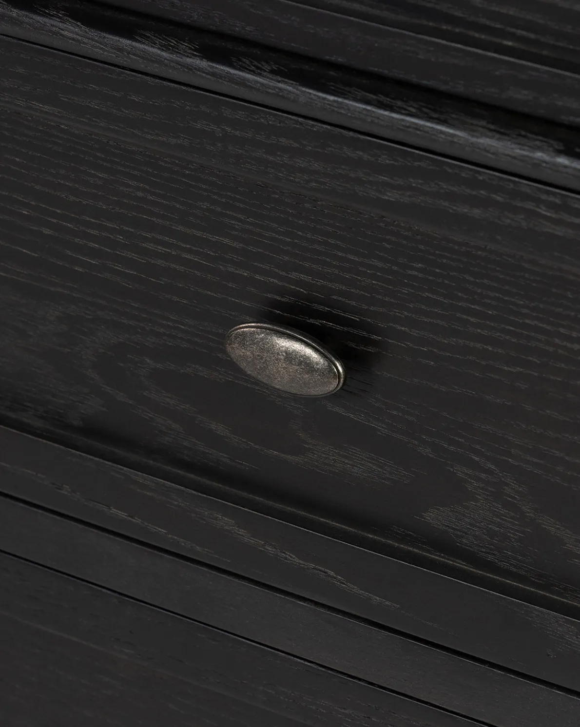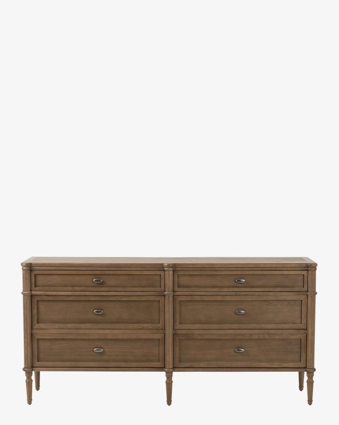 In an updated traditional design, the Dixon 6-Drawer Dresser draws the eye with its spindle legs and warm finish. Crafted from oak, this approachable design is finished with oval aged brass pulls, lending an elegant detail to your bedroom styling.