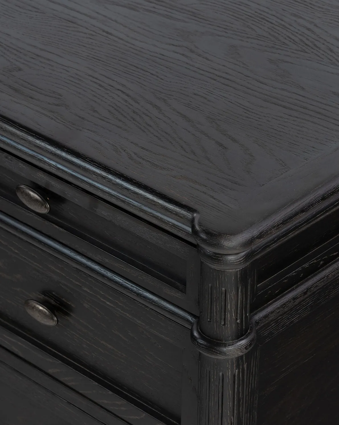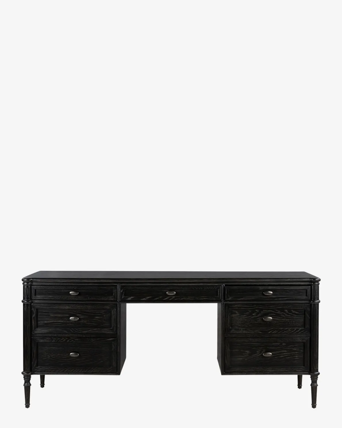 With either a distressed black or toasted oak finish, the Dixon Desk is made from oak with sleek iron hardware in an aged bronze finish. The natural graining on the desk gives an organic feel to any office, while the full structure adds approachable sophistication.