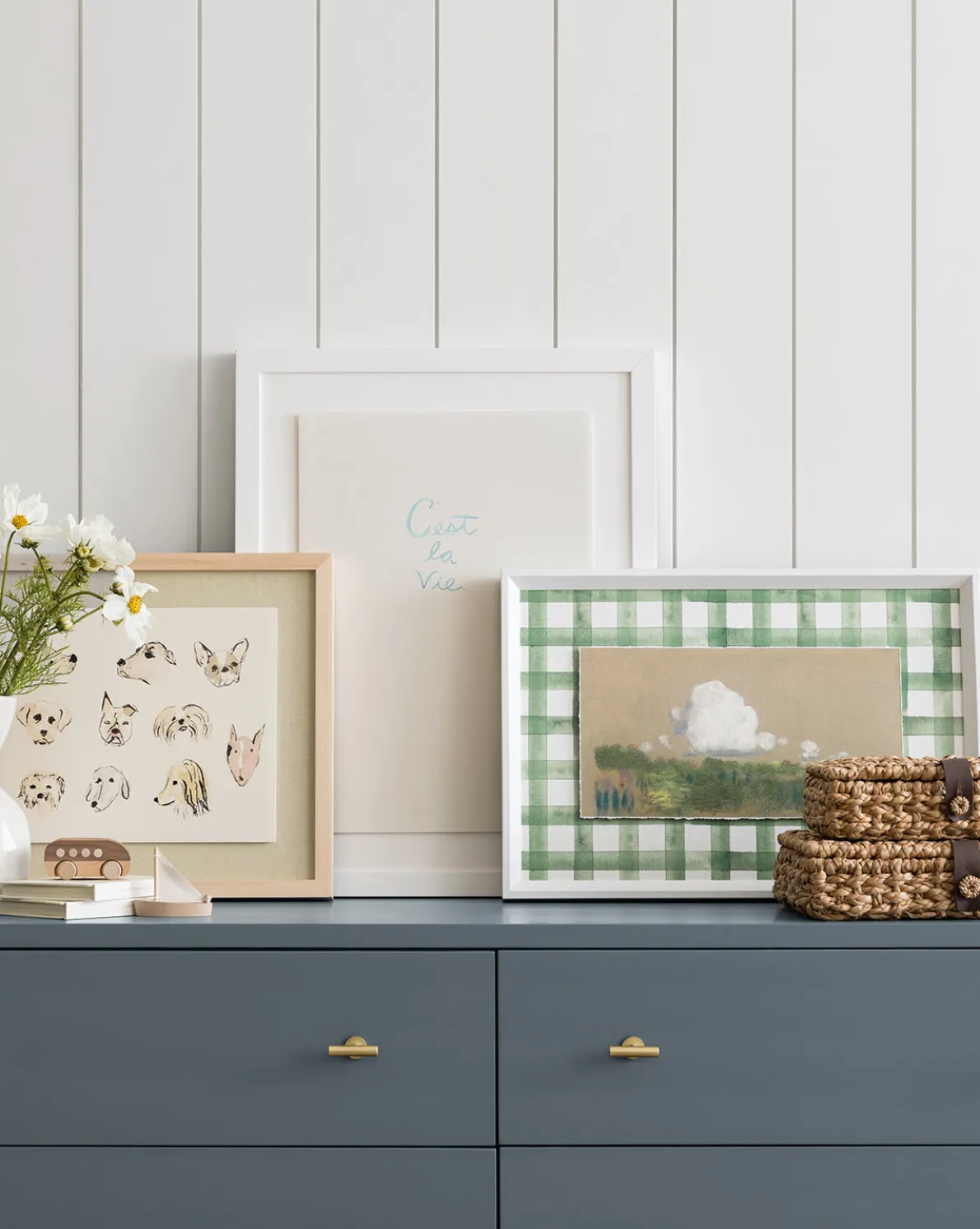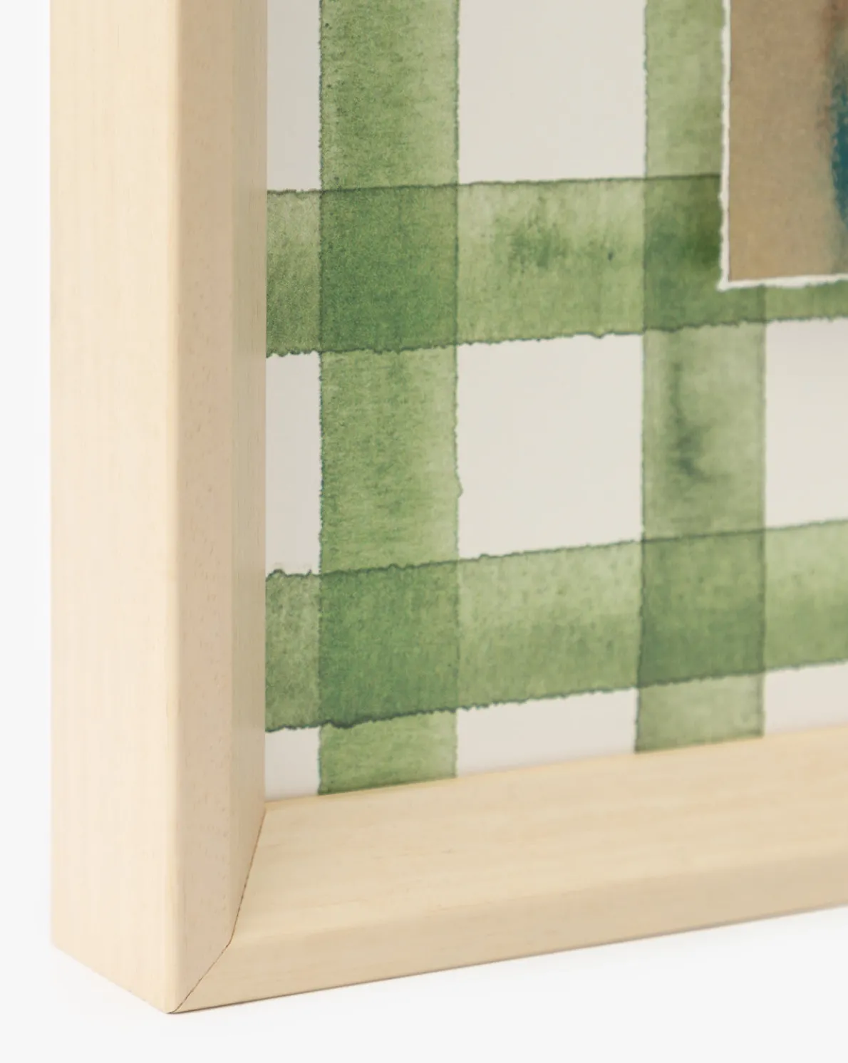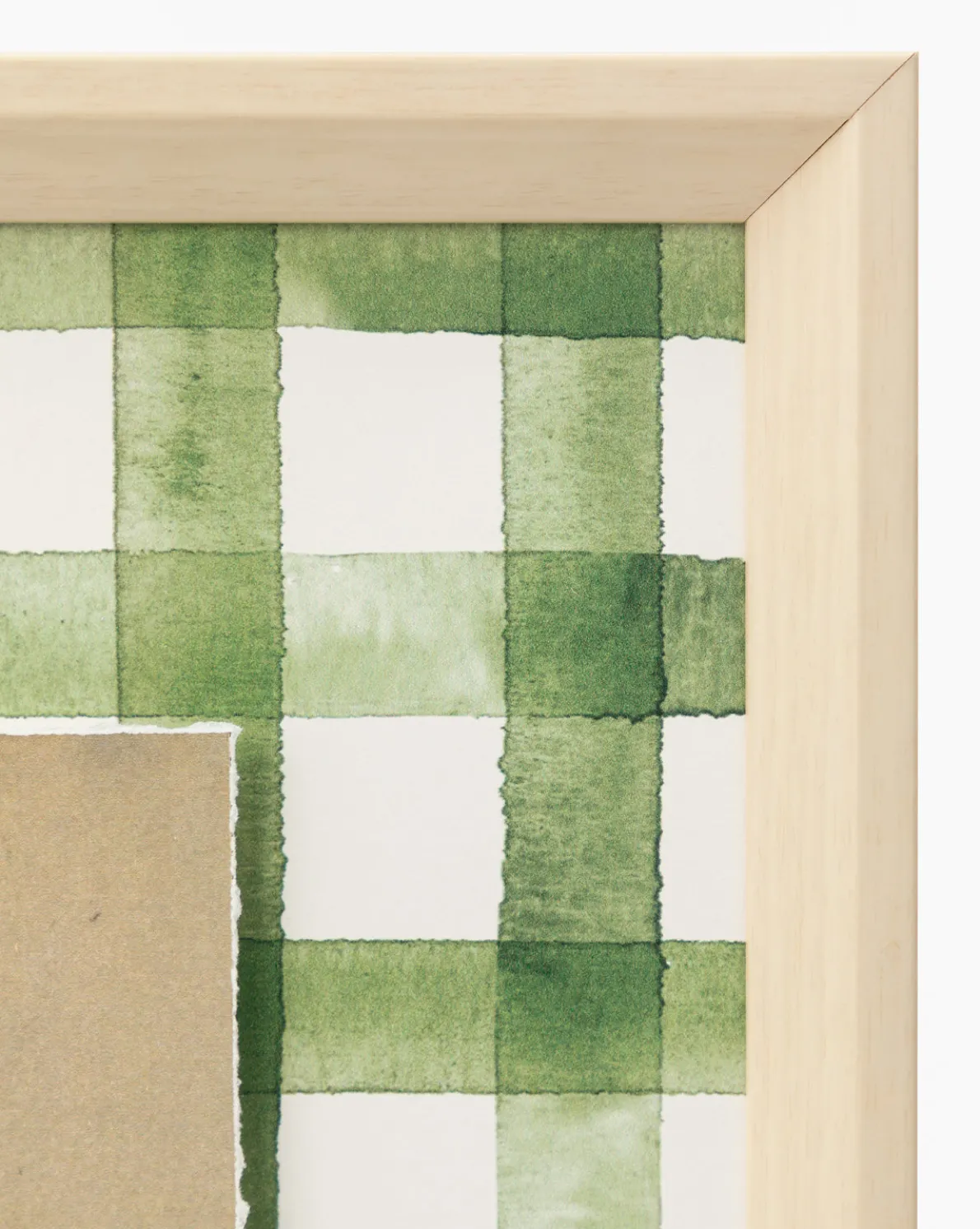 With a timeless feel and captivating palette, Dreamscape brings a playfully sophisticated feel to your decor. The giclee print on watercolor paper is hand-deckled and floated on a mat with a gingham motif.