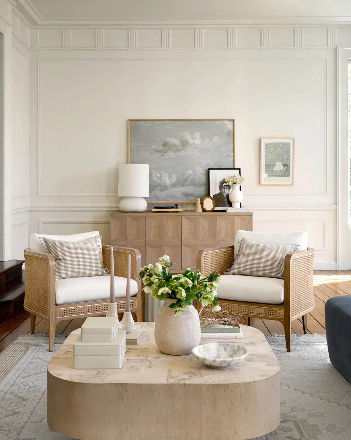 Expanded from our best-selling outdoor chair, the Elowyn Indoor Chair is crafted from a continuously curved frame of solid oak. Detailed with natural caning and complete with comfortable cushions in a soft linen and cotton blend, this piece brings an organic, casual tone to your living spaces.