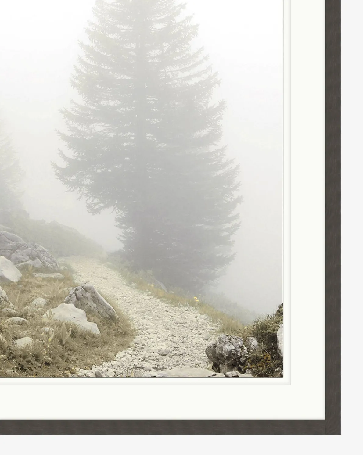 Depicting a mysterious yet inviting misty path, Foggy Mountain I speaks to wanderlust and imagination through creative photographic composition. The piece is a giclee print on matte paper and presented with double mats and a black woodgrain frame.