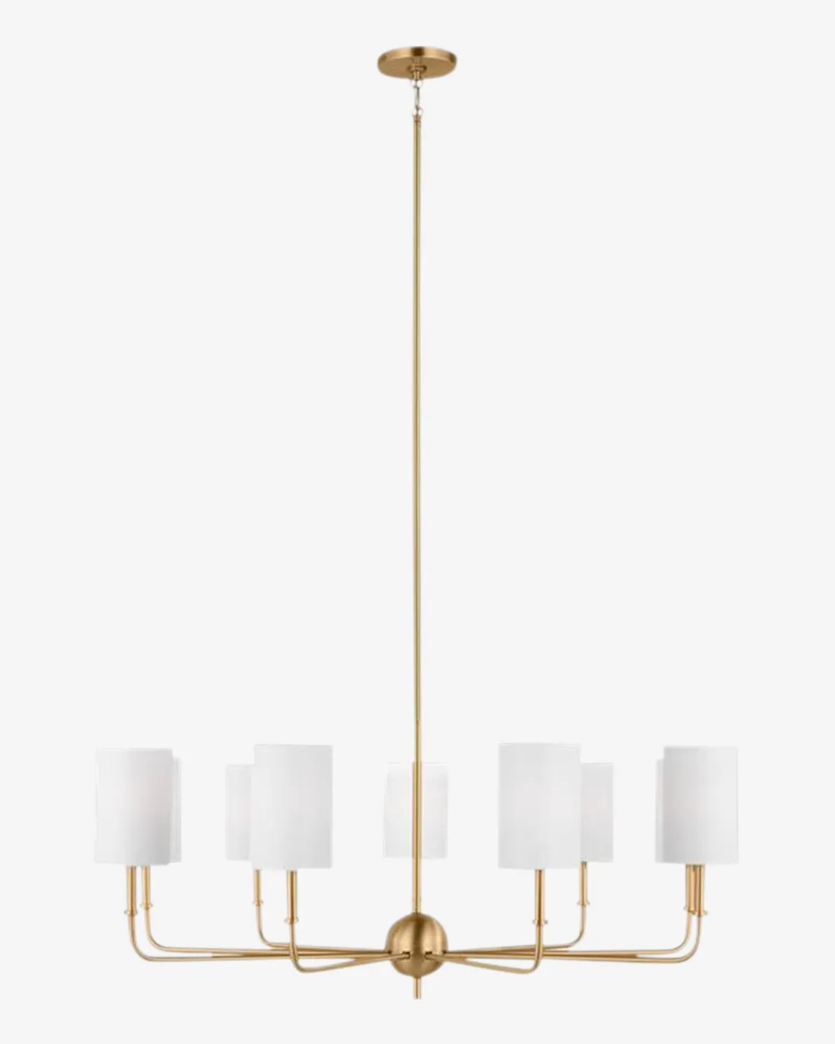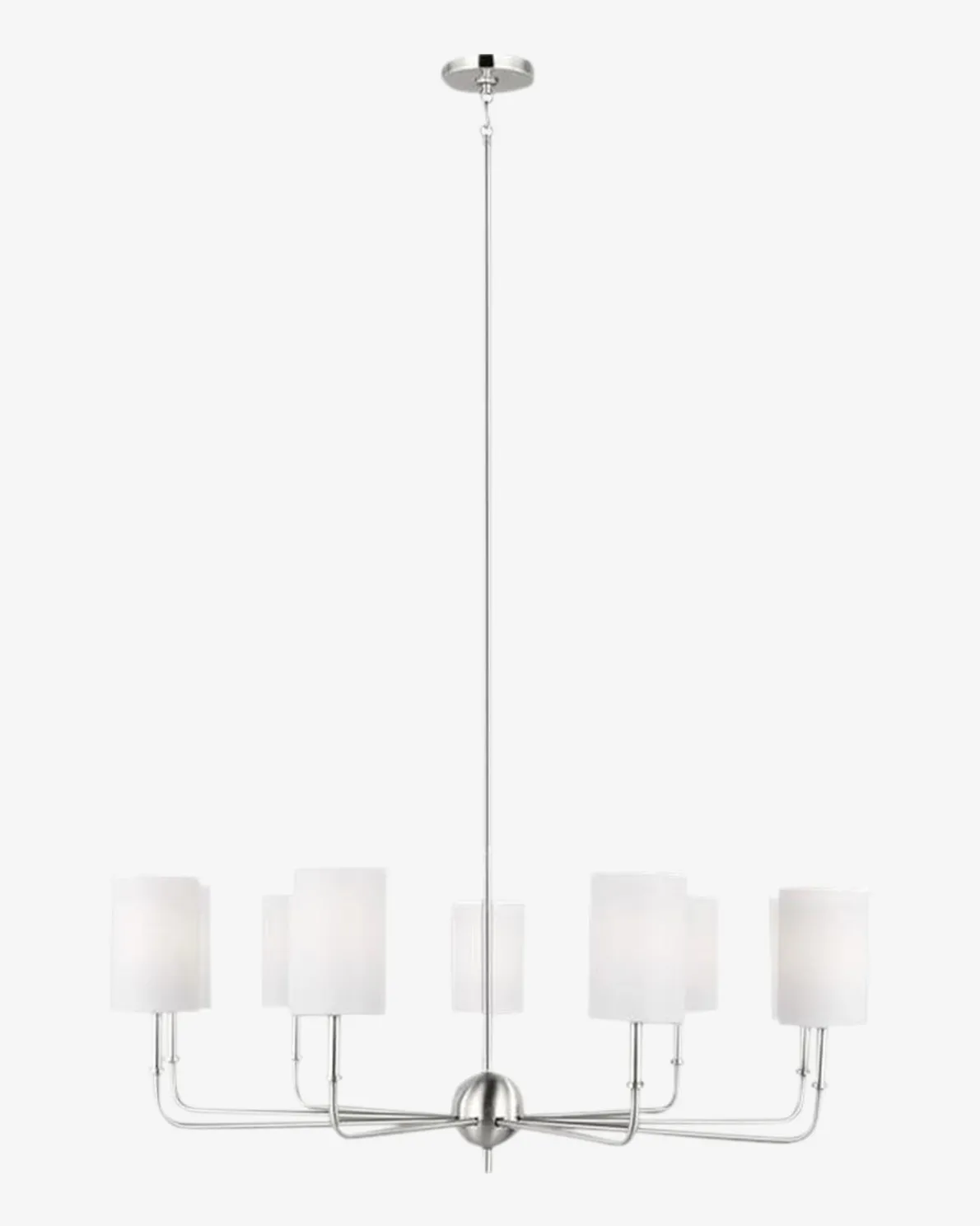 Elegant and geometric, the Foxdale Nine Light Chandelier boasts thoughtful craftsmanship with its subtle details. The metal structure is finished in one of three timeless finishes to complement the white linen shades. With its classic silhouette, the chandelier casts beautiful light into your space.