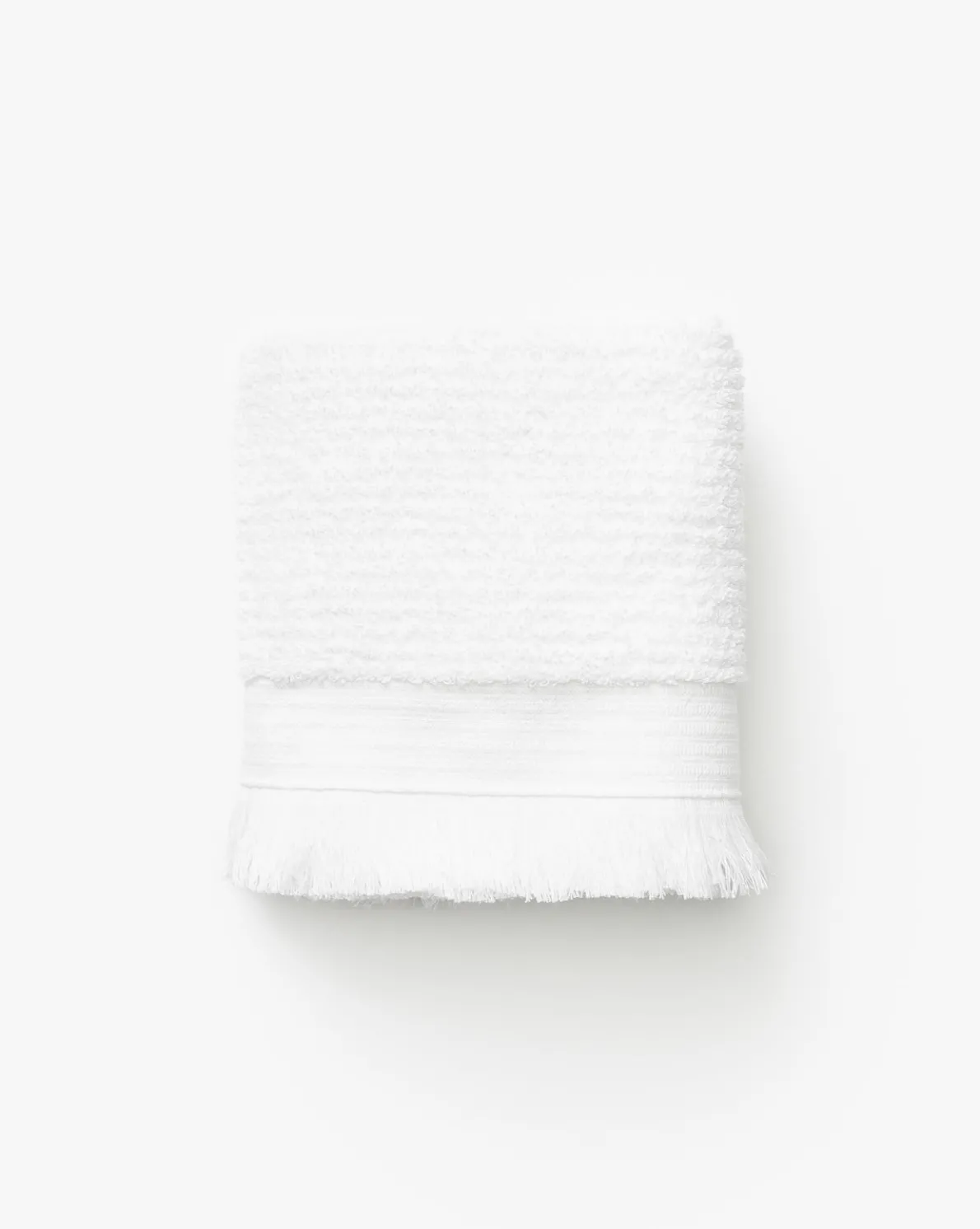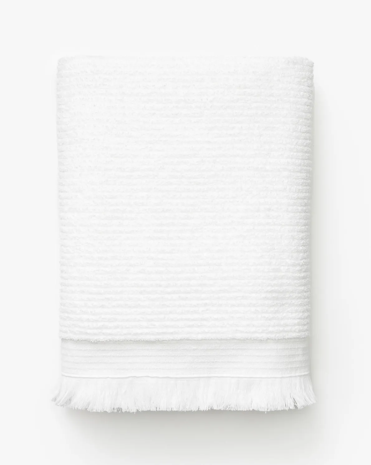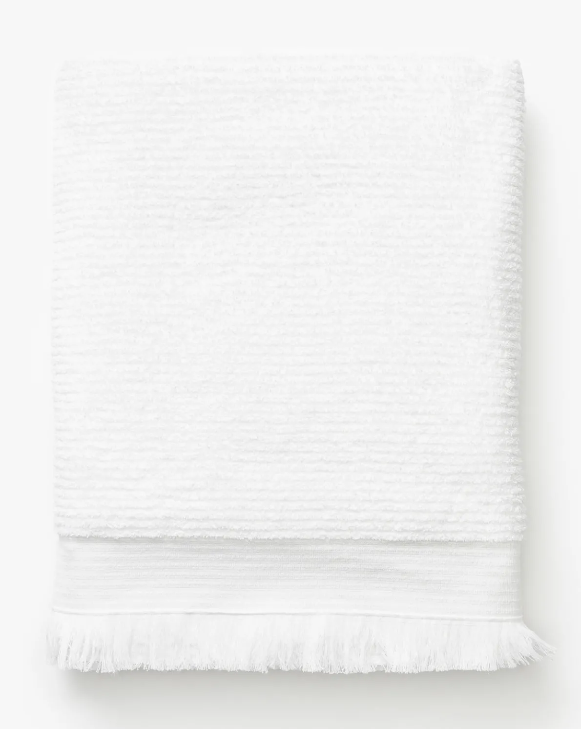 Textured and elegant, the Frayser White Bath Collection is made from 100% long staple Turkish cotton. The simple white colorway is easy to style with your bathroom decor, while the high-quality construction of the hand towel, bath towel, and bath sheet lends itself to comfort and durability, only growing softer with time.