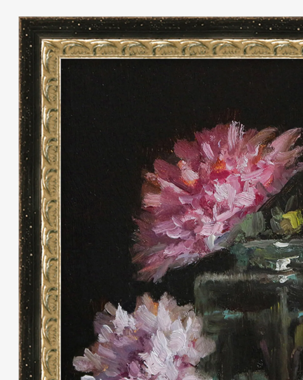 Framed with vintage detail in mind, this piece does muted color in a new way with blooming flowers at the forefront of its deep black and brown background. Styled as part of an eclectic gallery wall, or simply leaned in a bookcase, this painting brings an effortlessly elevated feel wherever it’s placed.