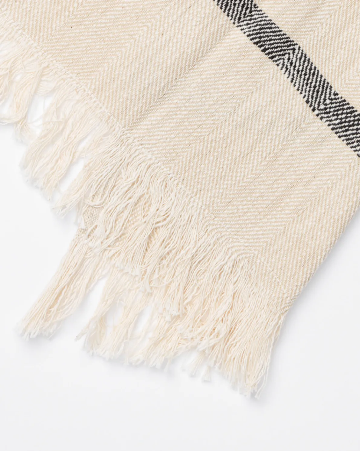 An elevated take on a casual kitchen towel, the Fringed Striped Towel is woven from cotton with a loose, playful fringe. Its stripe accentuates its weave, and the nude beige color palette carries an organic appeal. Styled in the kitchen, the Fringed Striped Towel gives an inviting warmth to the space.