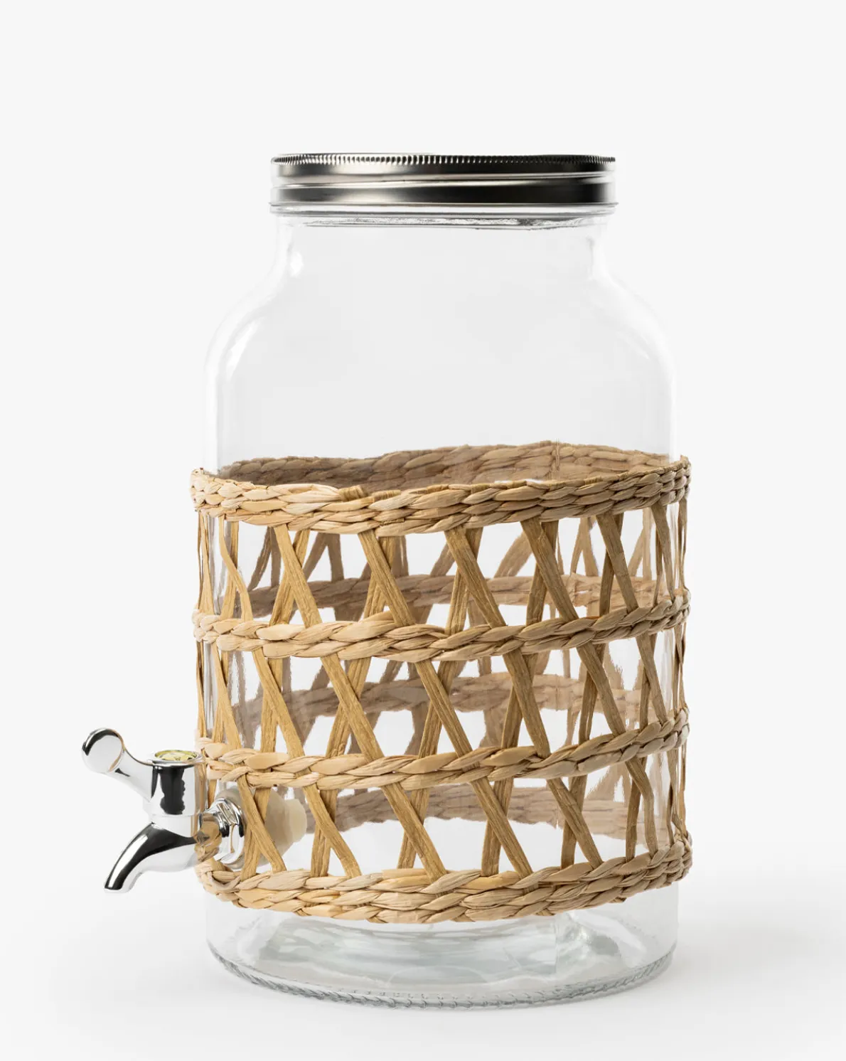 Combining style with functionality, the Glass Beverage Dispenser with Woven Sleeve is perfect for both everyday use and when hosting special occasions. Featuring a glass jar drink dispenser wrapped in an elegant intricately woven seagrass sleeve, it adds natural texture and charm to your table or countertop.