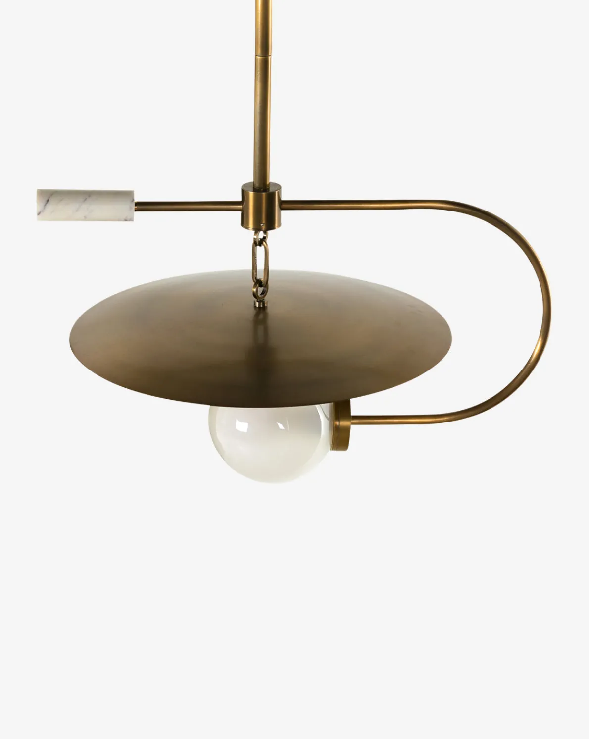 Contemporary in design, the Harpo Pendant has an artful shape that plays with shape and line. White marble detailing and an antique brass finish lend a material focus to the piece, highlighting the care and detail expressed in its form.
