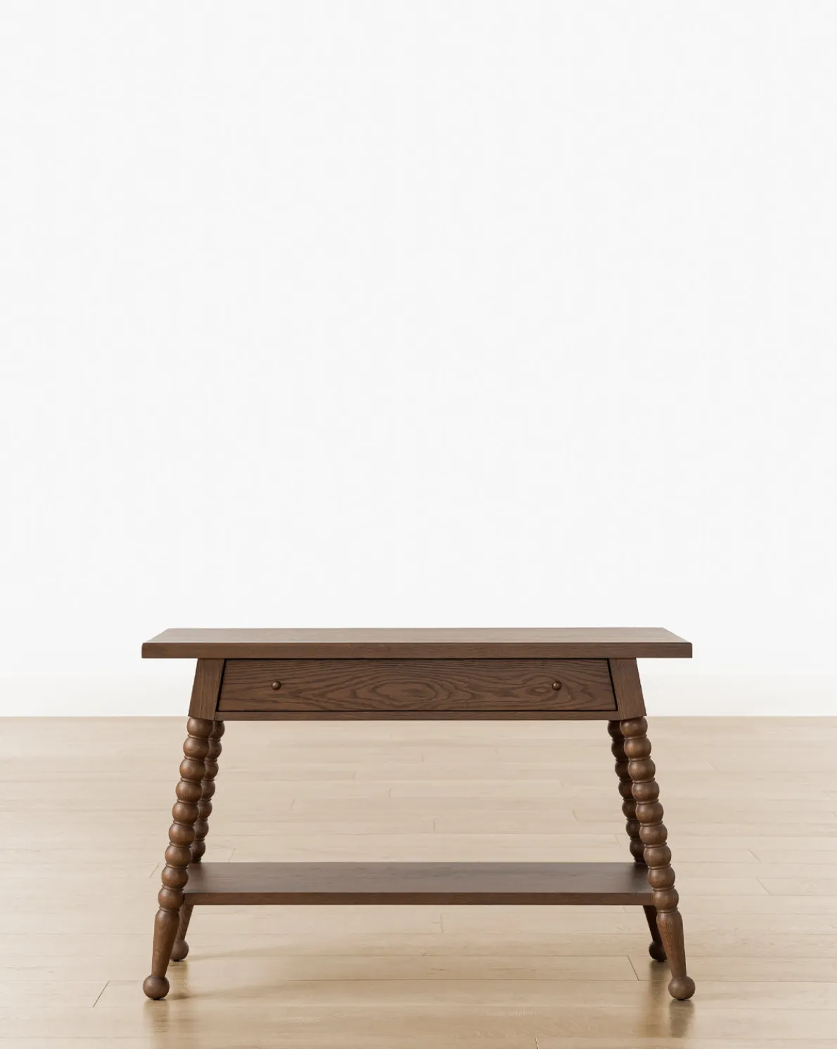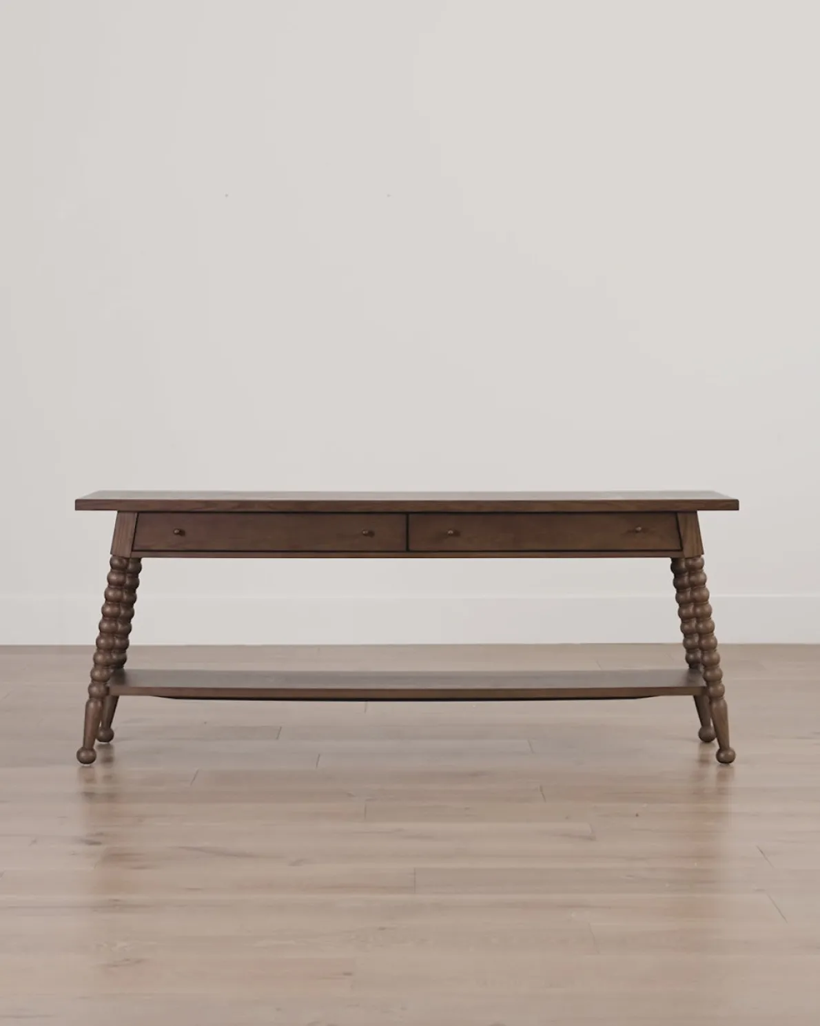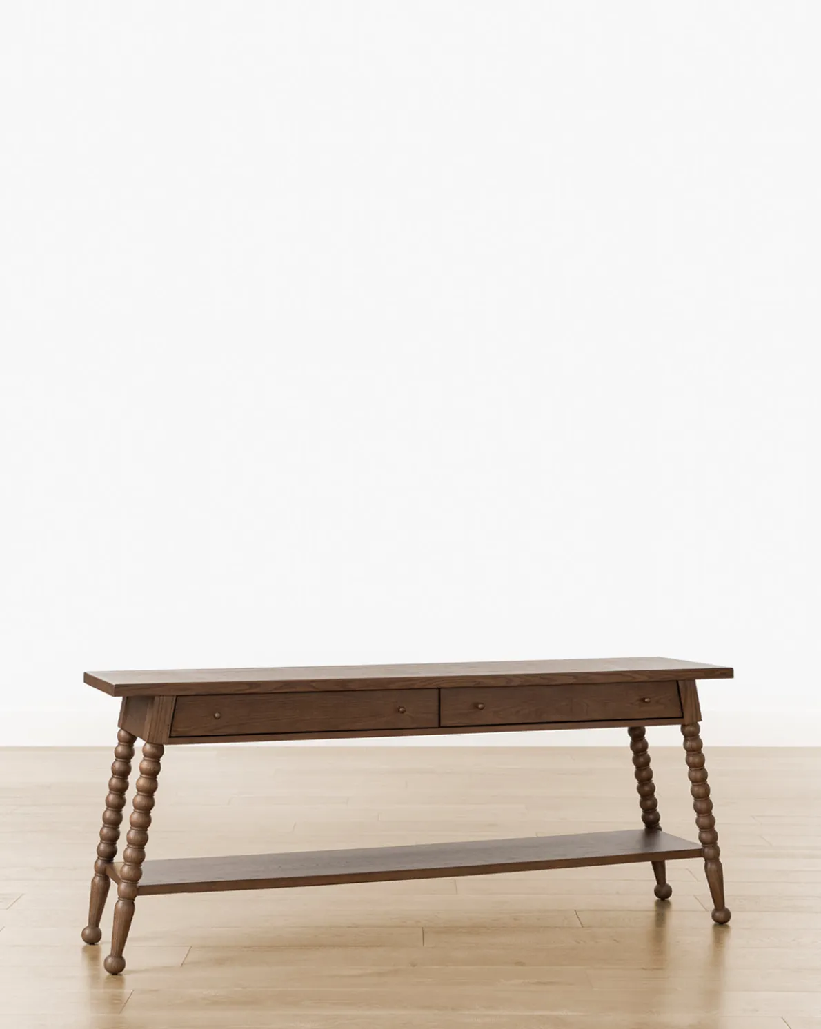 A traditional design reimagined. Featuring our take on the classic bobbin-style, our Heathcliff Console elevates your home styling with refined character and enduring craftsmanship. The two-drawer console has a rich walnut oak finish that exudes a chic elegance while creating a warm and inviting atmosphere. Distinct yet versatile, it is a beautiful addition to a range of interior aesthetics.