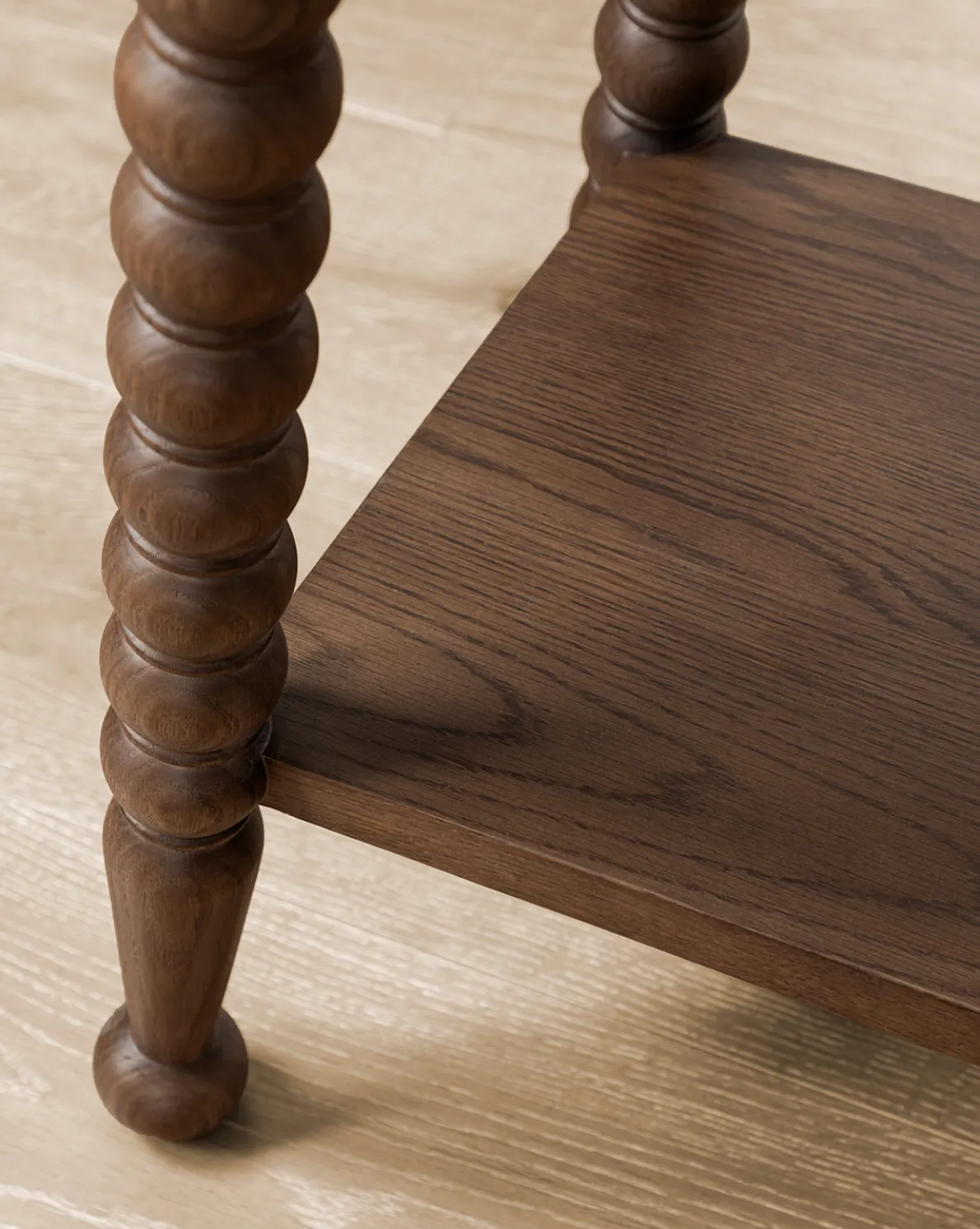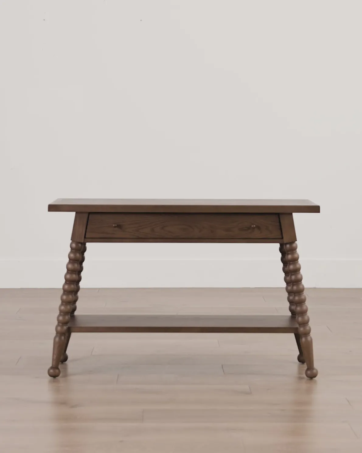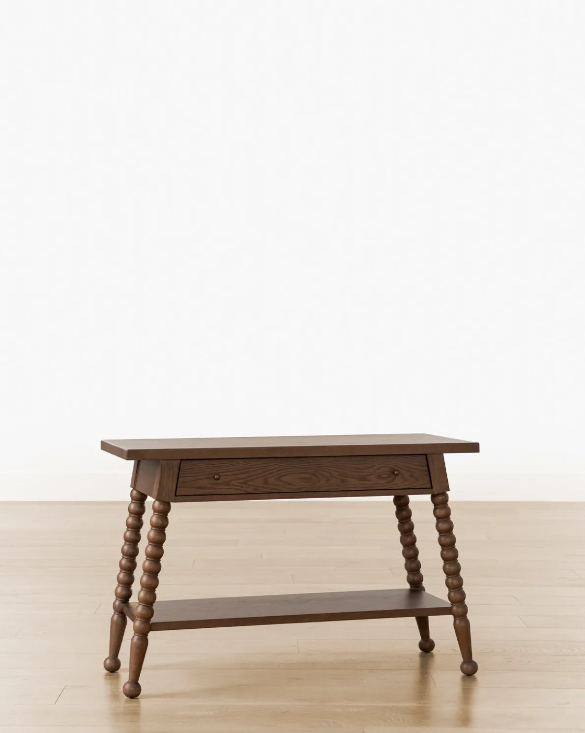 A traditional design reimagined. Featuring our take on the classic bobbin-style, our Heathcliff Console elevates your home styling with refined character and enduring craftsmanship. The two-drawer console has a rich walnut oak finish that exudes a chic elegance while creating a warm and inviting atmosphere. Distinct yet versatile, it is a beautiful addition to a range of interior aesthetics.