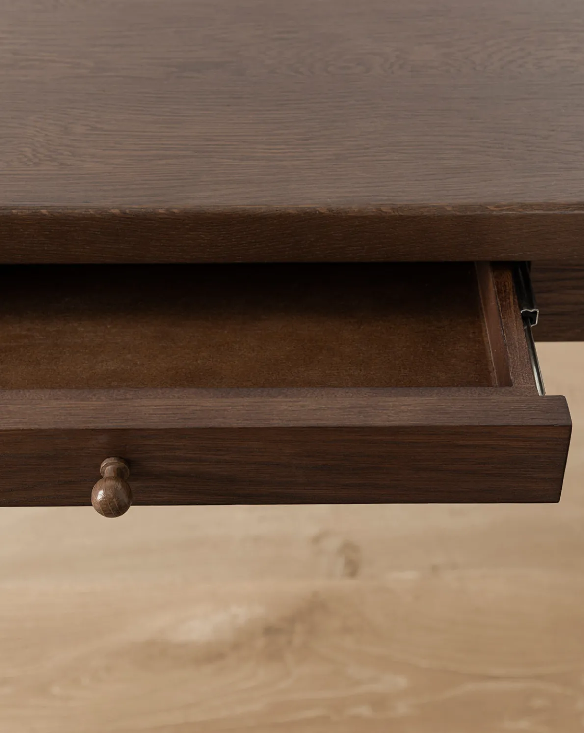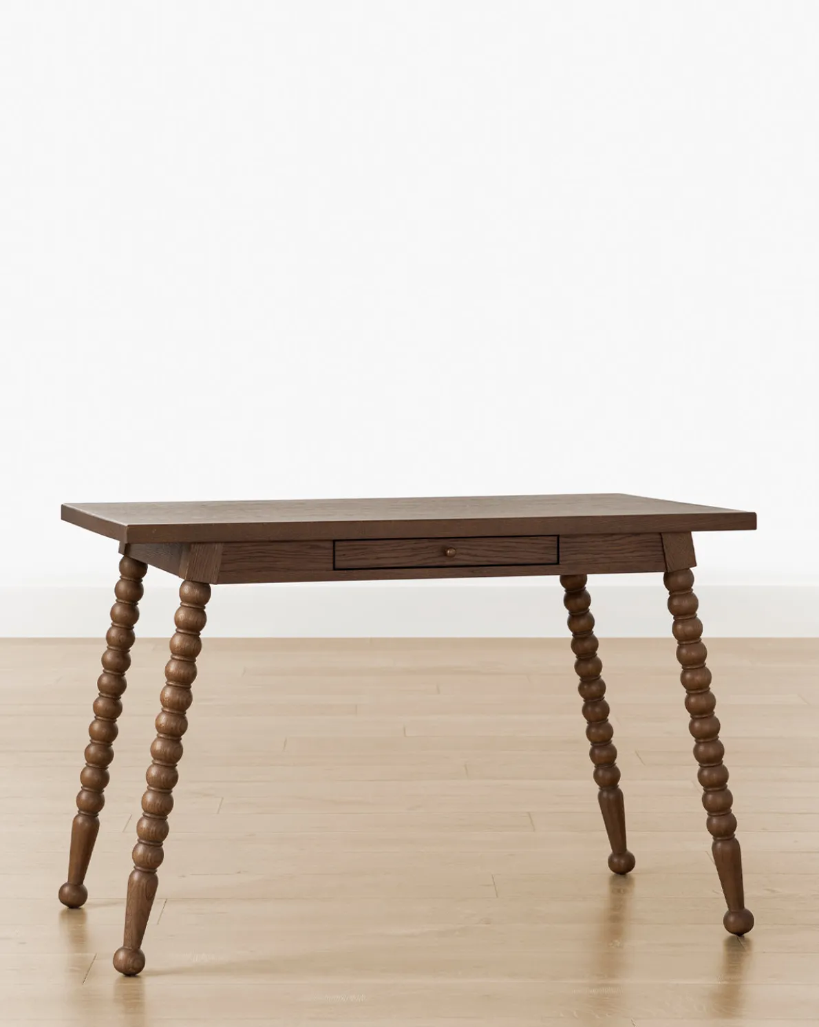 A traditional design reimagined. Featuring our take on the classic bobbin-style, our Heathcliff Desk elevates your home office with refined character and enduring craftsmanship. With a rich walnut oak finish, it exudes a chic elegance while creating a warm and inviting atmosphere. Distinct yet versatile, it is a beautiful addition to a range of interior aesthetics.