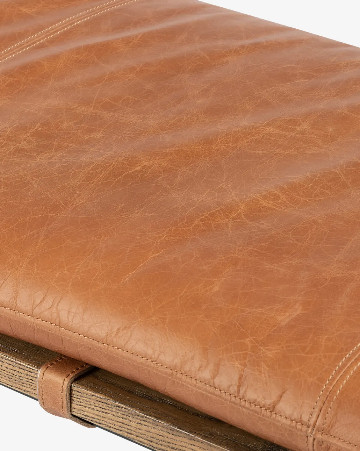 Inspired by French antiques, the Jagger Accent Bench combines leather, wood, and iron to create a stunning bench for your living spaces. A comfortable layer of top-grain leather rests on a solid nettlewood bench supported by architectural iron legs in this refined transitional piece.