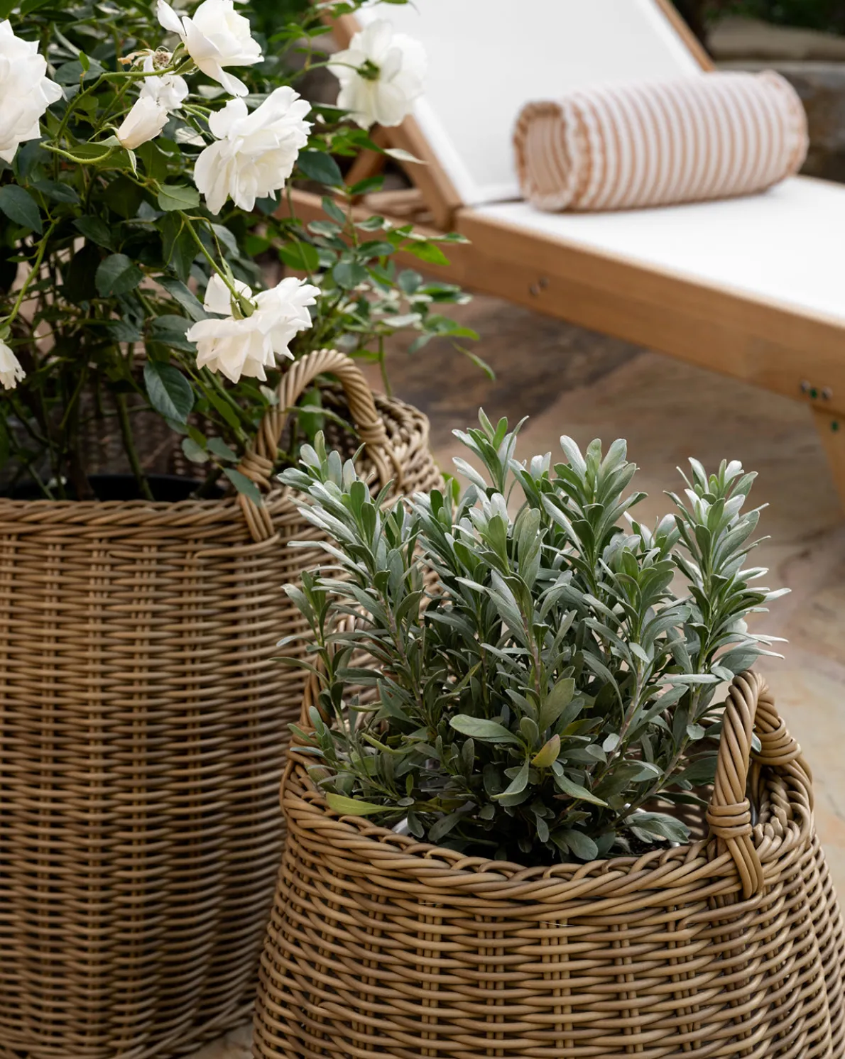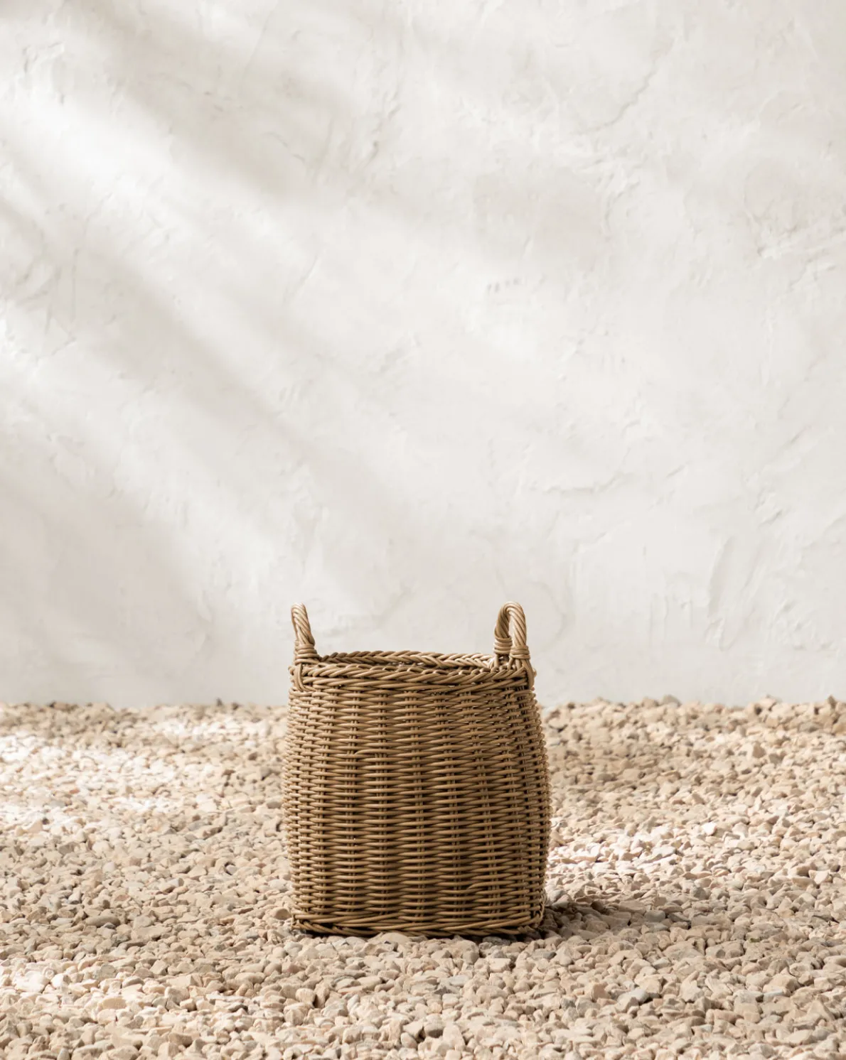 Intricately woven in poly-rattan, the Lightwash Handled Planter Basket has a clever box design with rounded edges. Lined with a plastic insert, this piece is ready to handle small indoor plants or standalone as a textural addition to home decor.
