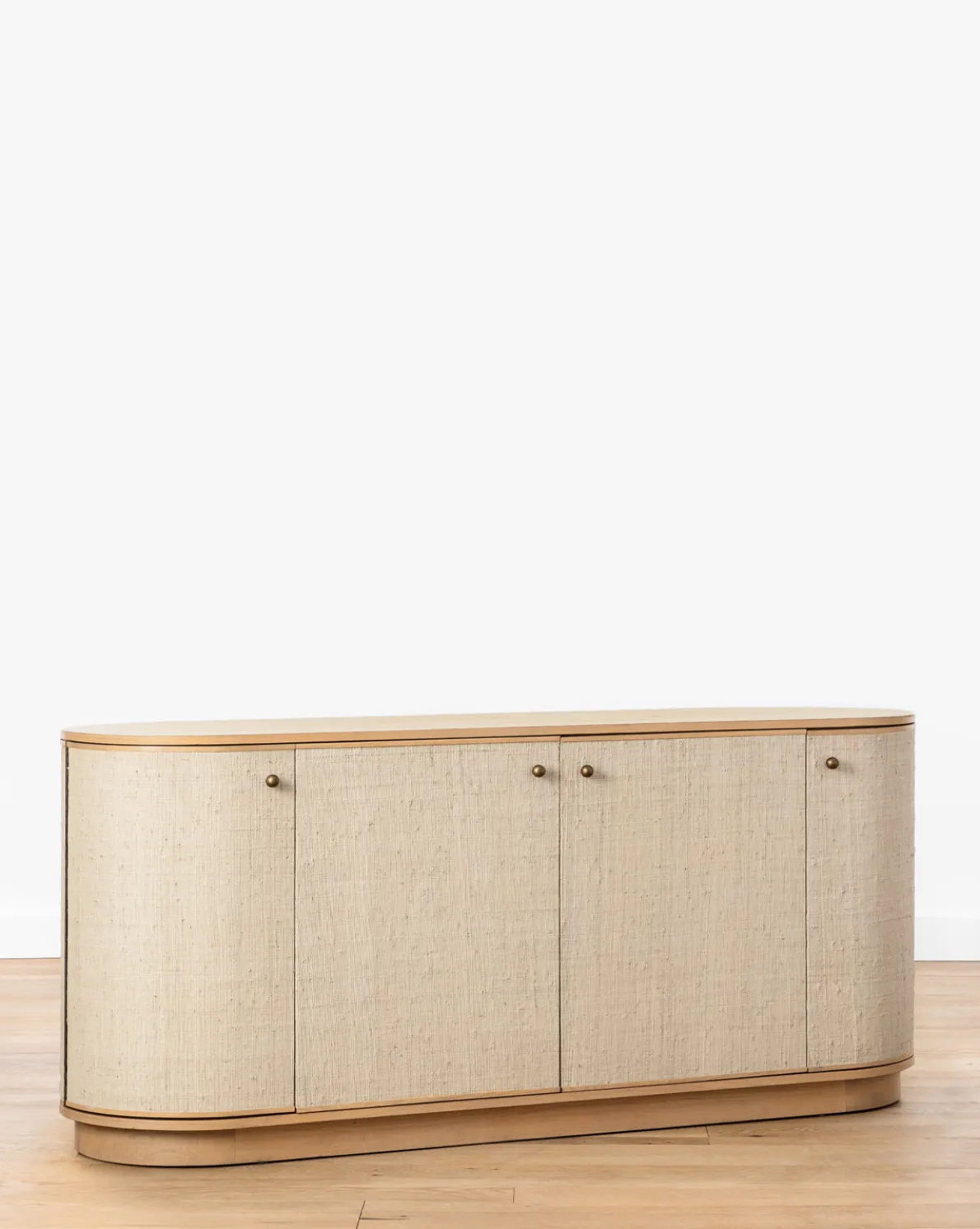 Made with white oak and wrapped in a natural grasscloth, our Linu Woven Sideboard is both sleek and textural. Its rounded form brings a unique and modern feel to your space, adding subtle detail with its natural textures. With interior shelves, the sideboard adds seamless functionality to your home.