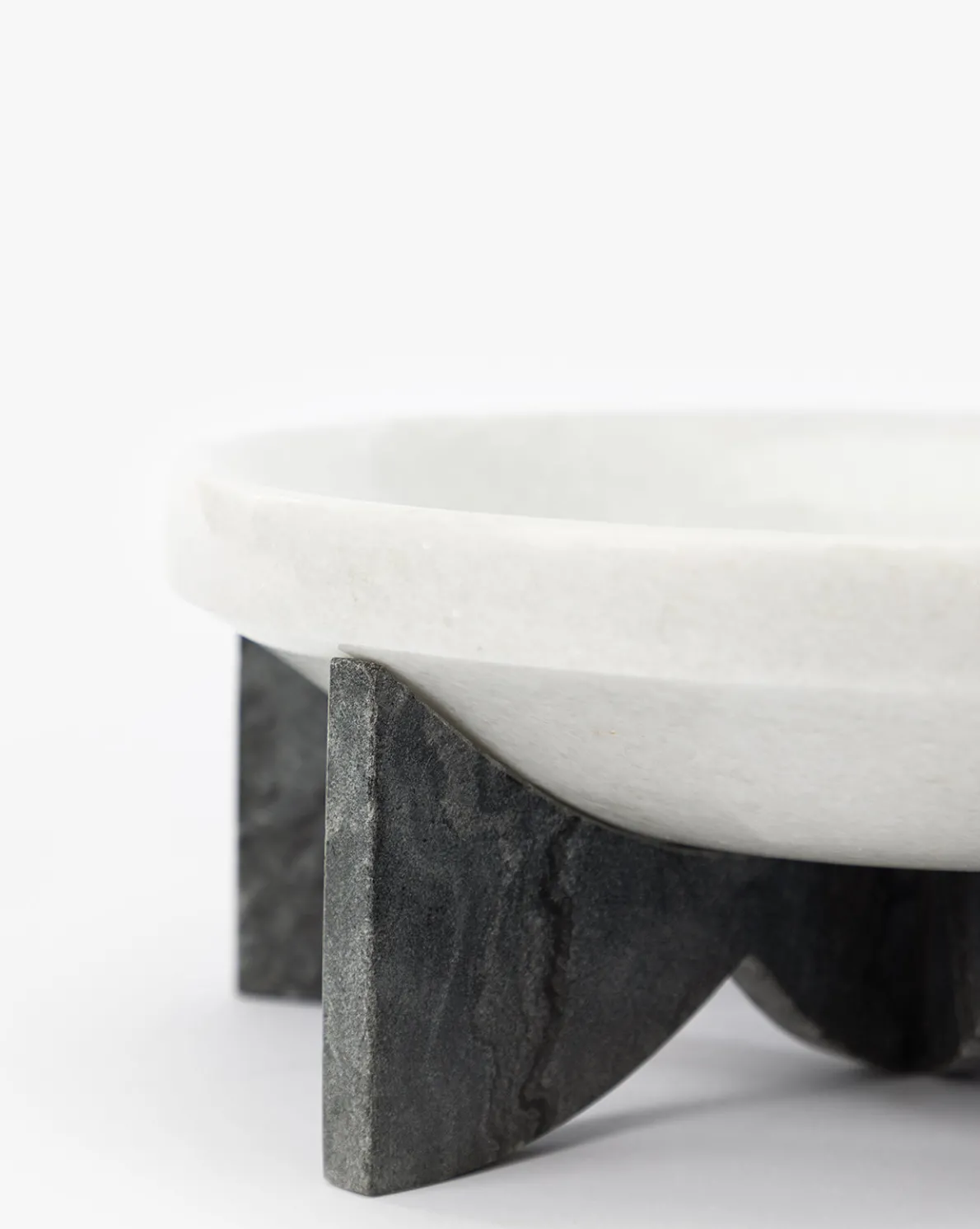 Luxuriously detailed, the Mahoney Bowl is brimming with natural marbling and designed in a stunning sculptural silhouette. Its white marble shallow bowl is held by a black marble base, creating a subtle lift that accentuates the elegant curvature of the piece.